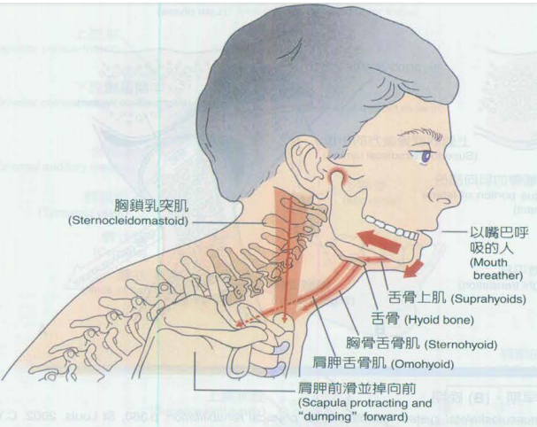 比如颈椎过度前伸,颈前部的肌肉就会将下颌骨向下向后拉,导致颞下颌关节压力过大。如下图: