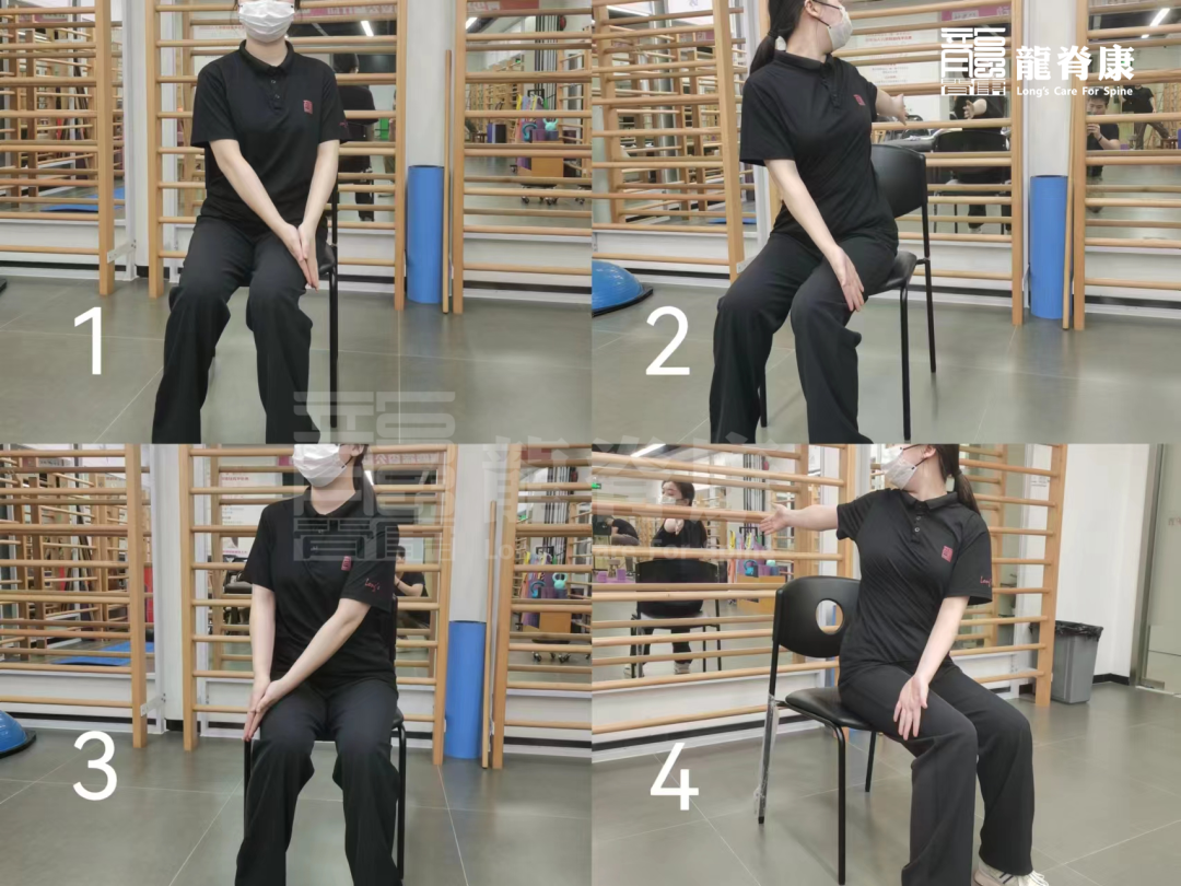 坐在凳子上,脚踩稳地面,双手合掌放置在一侧大腿,吸气不动,吐气时一手抵在大腿外侧辅助躯干旋转,一侧手向后旋转带动胸廓,同时眼睛看着旋后手的方向(交替进行,共5分钟)。