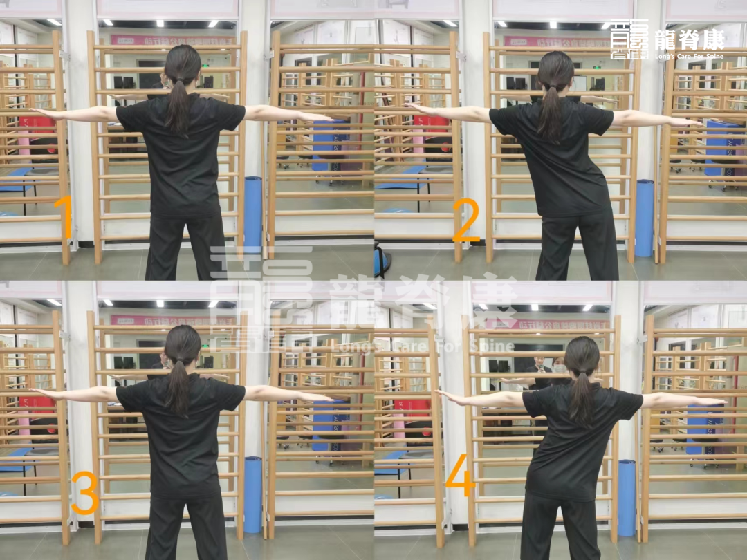 双脚打开与肩膀齐平,双手平举过肩,保持双手平行,一侧手向远处伸展,两侧交替进行。(重复5分钟)。