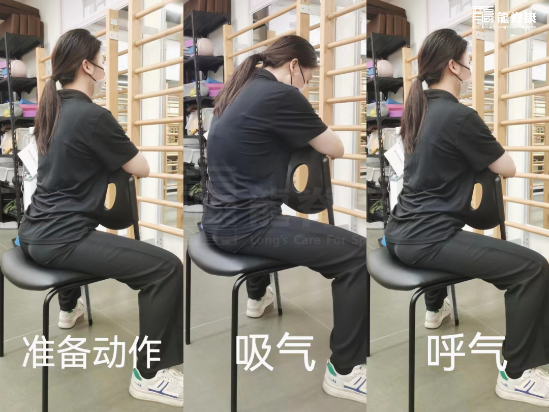跨坐在椅子上,双脚踩稳地面,双手放在靠椅上,配合呼吸运动,吸气低头弓背,尽量气体吸至背部打开胸廓,吐气时抬头收腹,恢复腰部生理曲度(重复5分钟)。