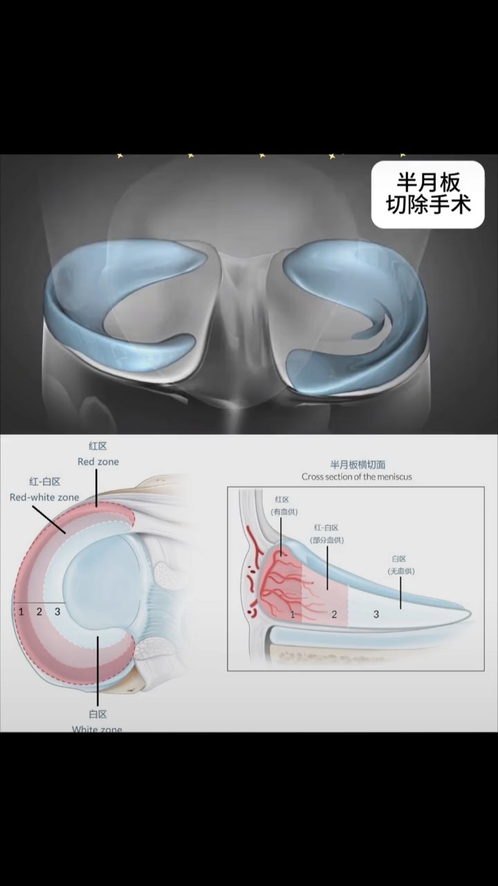 · 红区(血供区):半月板的外侧约1/3部分有丰富的血液供应。这个区域的撕裂: