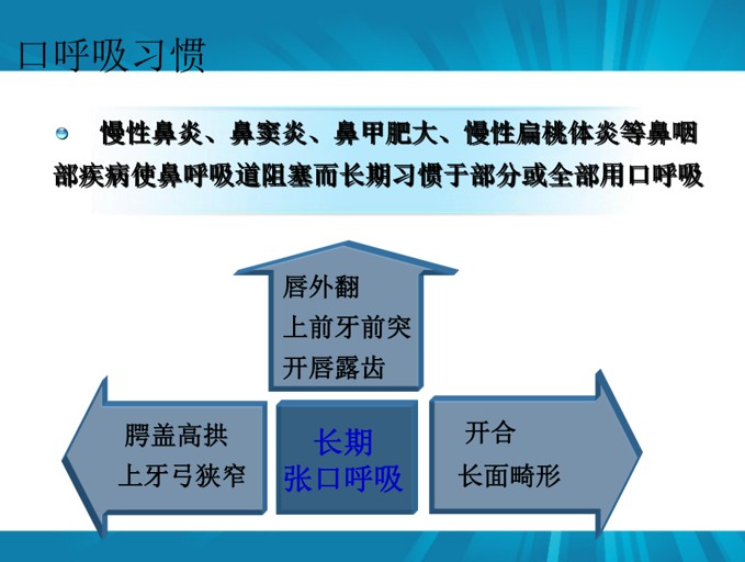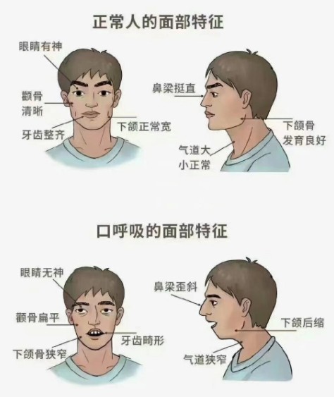 至于现在儿童很常见的鼻炎,腺样体肥大等耳鼻喉科疾病导致的口呼吸,比如表现在睡觉打鼾,长大嘴巴睡觉等,由于夜晚孩子是在生长发育的高峰,下颌骨就很容易往后发育成后缩型;由于口呼吸的氧通气量不如鼻腔呼吸,所以孩子轻微缺氧,导致黑眼圈;张嘴呼吸导致嘴巴的干燥,这类孩子也特别容易患龋齿(蛀牙)哦!