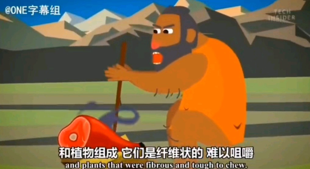 在我们几百万年前的祖先会用火之前,吃的主要是生肉等粗纤维之类的食物,那可得有嚼劲了。