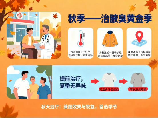 很多人觉得 “夏季腋臭明显,该夏天治”,但从治疗效果、恢复期来看,秋天其实是治腋臭的 “黄金季节”。秋季的气候特点(气温适宜、湿度低)能减少术后感染风险、缩短恢复时间,还能为次年夏季“提前备战”,避免异味反复带来的尴尬。