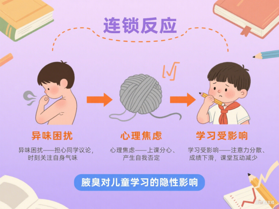 孩子因腋臭出现注意力分散、成绩下滑,本质是 “异味困扰→心理焦虑→学习受影响” 的连锁反应。家长若只关注“提升成绩”,忽视背后的腋臭问题,往往难以见效,需从“缓解异味、疏导心理、辅助学习”三方面协同处理,帮孩子打破恶性循环。