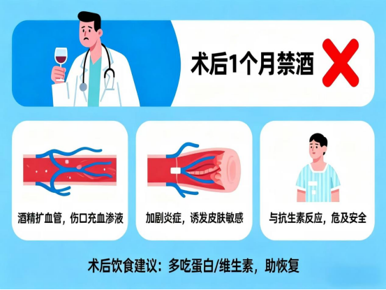 建议患者术后 1 个月内严格禁酒,1 个月后可先少量尝试,观察腋窝无红肿、瘙痒等不适再逐渐恢复;同时避免辛辣、刺激性食物,多吃蛋白质(如鸡蛋、牛奶)和维生素丰富的食物,帮助创面恢复。若术后不慎饮酒并出现不适,需及时就医处理。