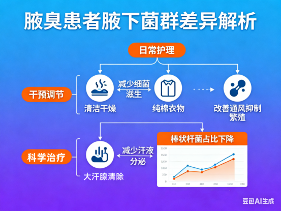 值得注意的是,这种菌群差异并非 “天生固定”,而是可以通过后天干预调节。比如保持腋窝清洁干燥,能减少细菌滋生;穿纯棉透气衣物,改善腋窝通风环境,可抑制棒状杆菌繁殖;若异味明显,通过科学正规手术治疗清除大汗腺,减少汗液分泌,也能让菌群比例逐渐恢复正常。临床中,很多患者术后腋窝棒状杆菌占比明显下降,异味也随之消失。