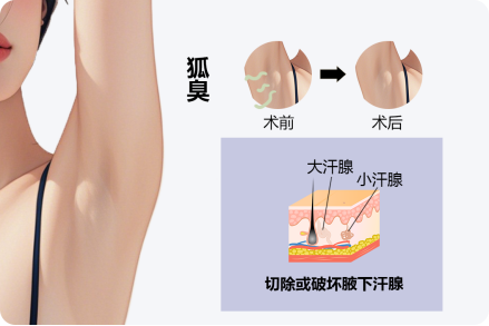 手术治疗的原理直接、彻底:通过物理方式,将腋下皮肤真皮层和皮下脂肪层中的绝大部分大汗腺组织予以精准地切除、破坏或吸出,从根源上消除产生异味的物质。
