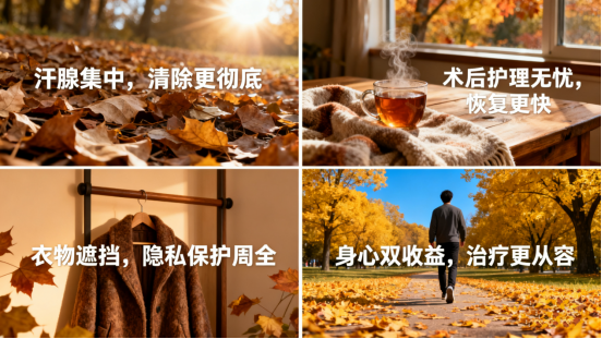 秋季人体代谢放缓,大汗腺分泌减少、分布集中。医生可通过高清可视设备精准定位、高效清除异常汗腺,降低复发风险,疗效更稳固。
