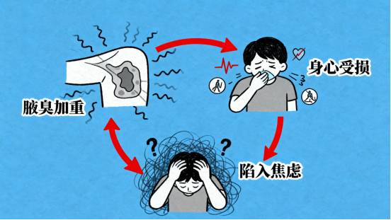 腋臭带来的尴尬、自卑和社交恐惧,会让人不愿举手、害怕靠近他人,长期处于焦虑和压抑的情绪中。这种无形的心理压力会严重侵蚀自信心,影响学业、事业、人际交往和整体生活质量,形成越焦虑越严重、越严重越焦虑的恶性循环。