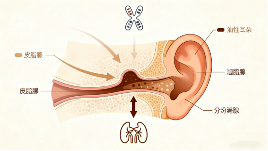 耳垢类型:腋臭与油性(黏腻型)耳垢(俗称“油耳朵”)有高度的遗传关联性。两者均由同一个基因调控大汗腺的分泌功能,因此,拥有油性耳垢的人,出现腋臭的概率远高于干性耳垢者。