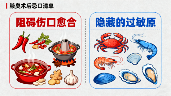 终于完成腋臭手术,迎来了清新曙光!但术后的饮食管理,直接关系到伤口愈合。吃对事半功倍,吃错可能延缓恢复。其中,辛辣和海鲜两类食物需要特别警惕。