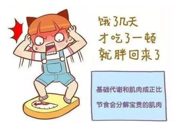 节食会导致营养失衡,短期减下来的不是脂肪,而是肌肉和水分。而节食因为蛋白质摄入严重不足,导致基础代谢率低。