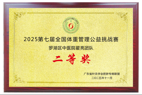 近日,由中华中医药学会中医体质分会、广东省针灸学会肥胖专病联盟联合举办的 2025 年第七届全国体重管理公益挑战赛颁奖礼落下帷幕,我院针灸二科凭借体质辨识为基础、饮食运动为核心的个性化方案以及参赛选手的显著成效,从众多参赛队伍中脱颖而出,成功荣获二等奖!这一荣誉不仅是对罗湖区中医院针灸二科医护团队专业能力的充分肯定,更是对“体质适配 + 科学养护” 体重管理模式独特优势的有力印证。