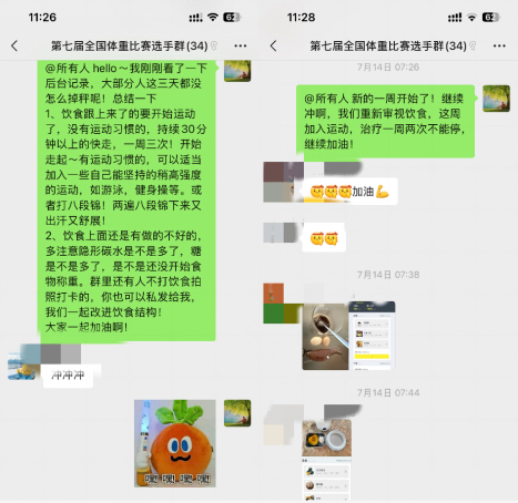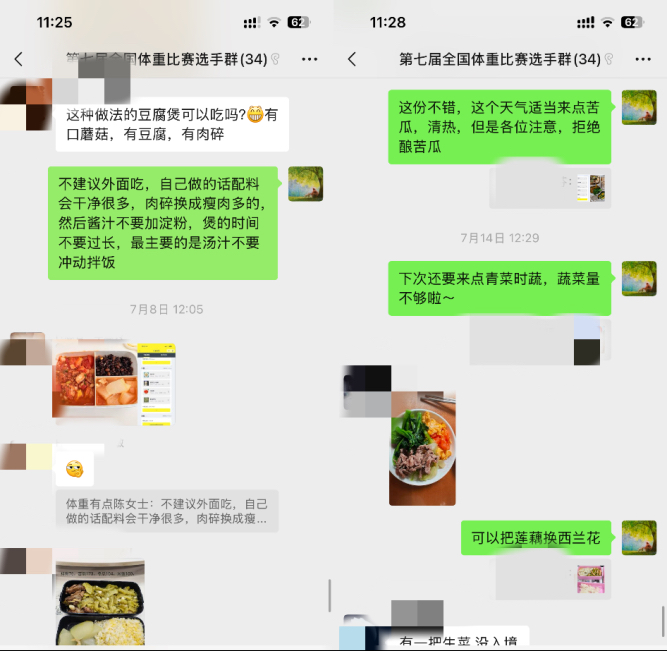 日常通过比赛群与小程序追踪选手饮食记录,要求食物称重并拍照打卡,对问题即时给出体质适配的专业建议,帮助建立 “营养均衡 + 体质适配” 的饮食理念。