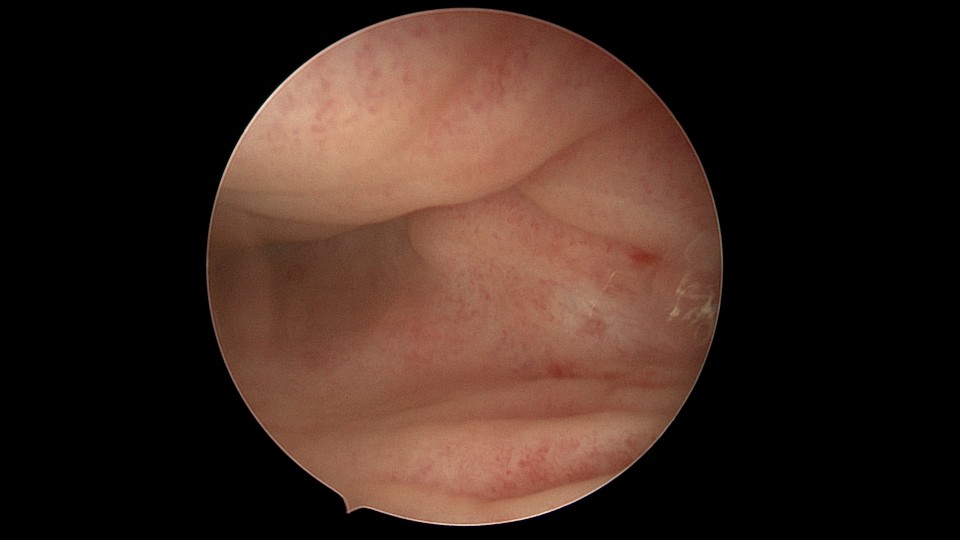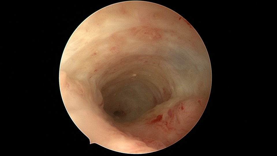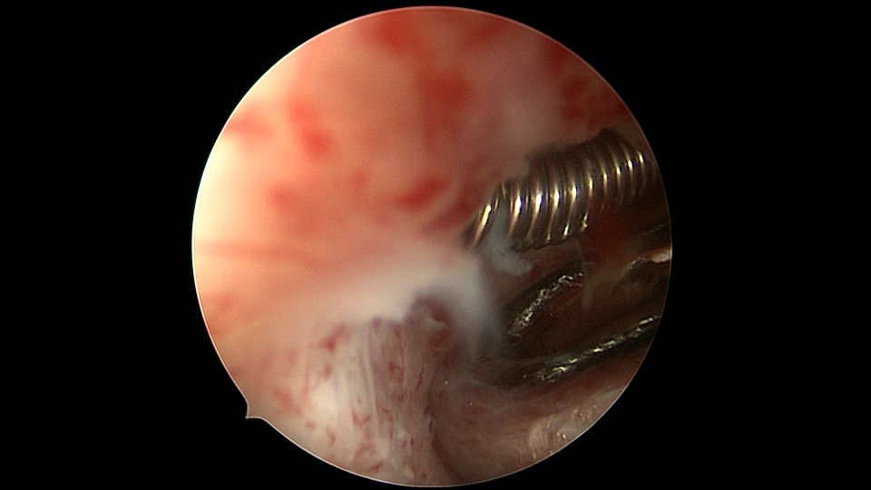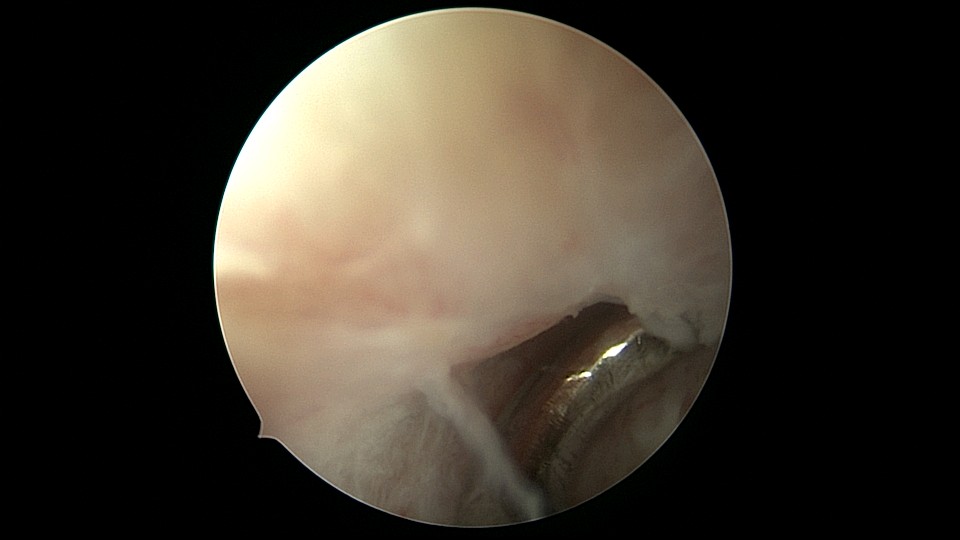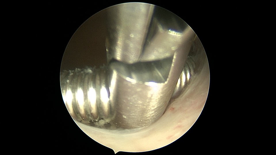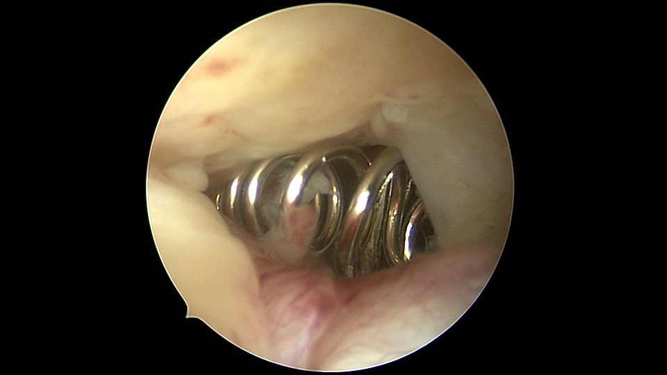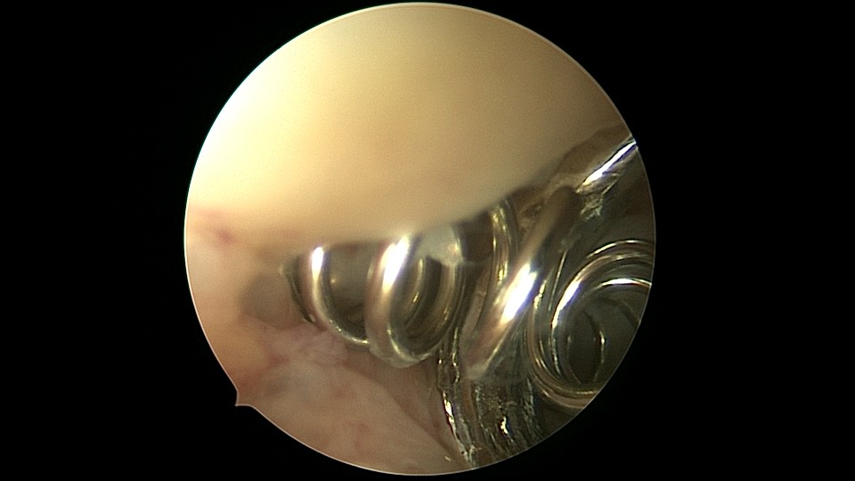 患者54岁,G1P1,剖宫产1次,安环30+年,绝经4年。40年前患者曾行左侧髋关节骨折手术,左下肢外展困难,患者肥胖,阴道很深,金属扩阴器和一次性扩阴器均无法暴露宫颈,用阴道内镜方式进入宫腔,但宫腔镜长度不够,远远能看见环,无法到达环的部位,再次试图暴露宫颈失败,用宫颈钳夹着阴道壁下拉,宫腔镜进入宫腔,但异物钳夹持力度不够,取出失败。用取环钩盲探沿宫腔镜外侧推挤进入宫腔,经历多次拧转,取环钩几乎向前弯成直角,直视下终于钩住节育环,掰直取环钩后缓慢拉出节育环,环变形。