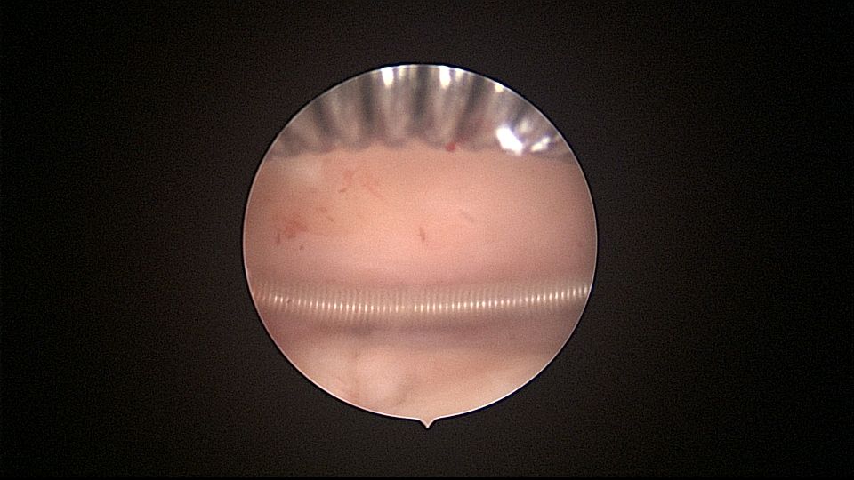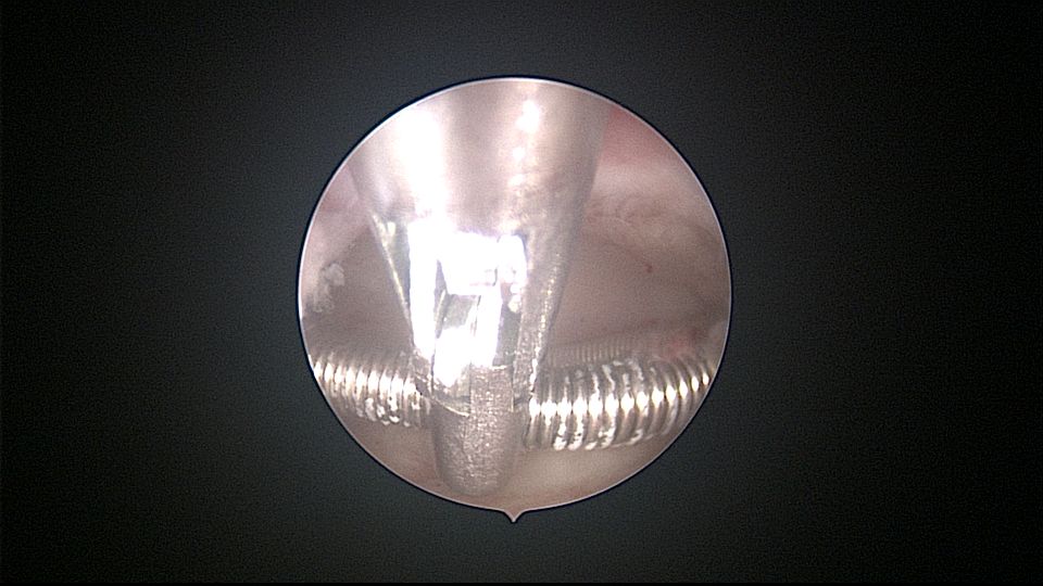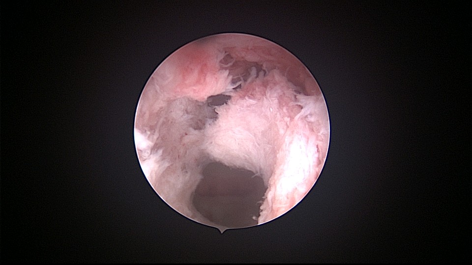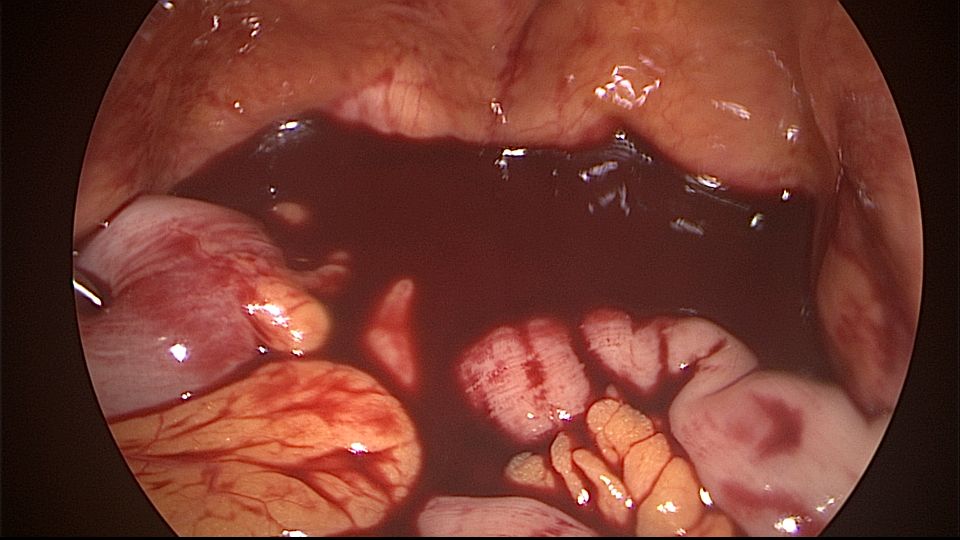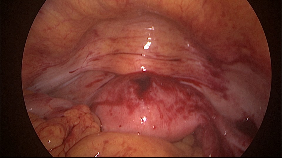 患者54岁,G1P1,顺产1次。安环33年,绝经3年,外院取环失败,子宫穿孔,盆腔积血。子宫后位,宫腔镜见宫颈管组织杂乱,宫颈管上段前壁不规则潜行假道,假道后侧寻找到宫颈内口。扩张宫颈内口,进入宫腔,见O型环位置正常,异物钳取出节育环,宫腔内看不到子宫穿孔。腹腔镜见盆腔积血约400ml,子宫前壁中段偏左见直径0.5cm不规则穿孔,少许渗血,缝合修补子宫穿孔。因左侧卵巢囊肿,患者及家属要求切除双侧附件。