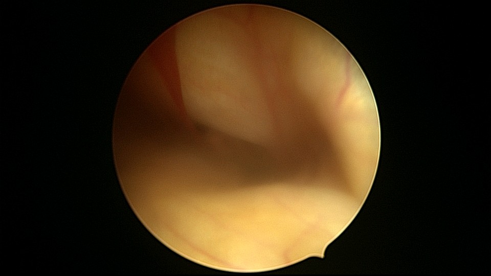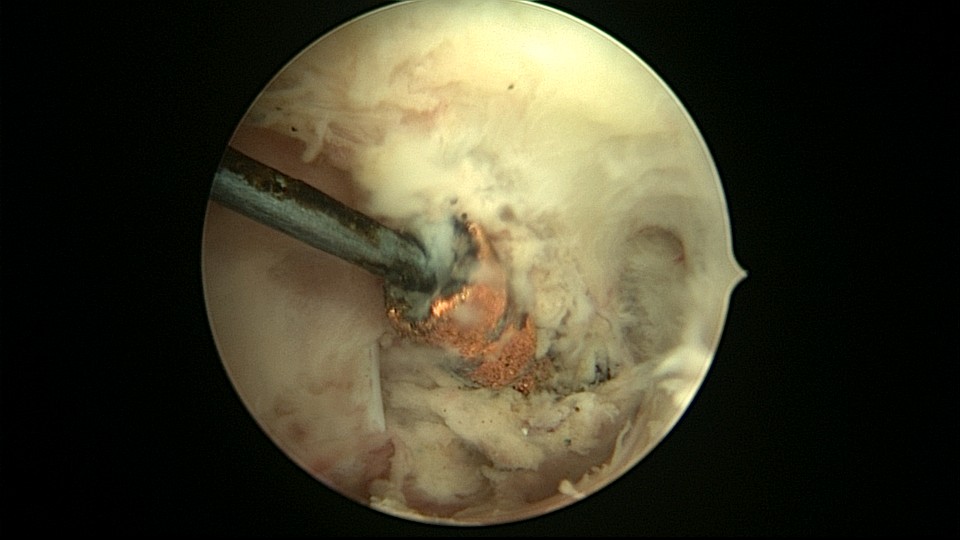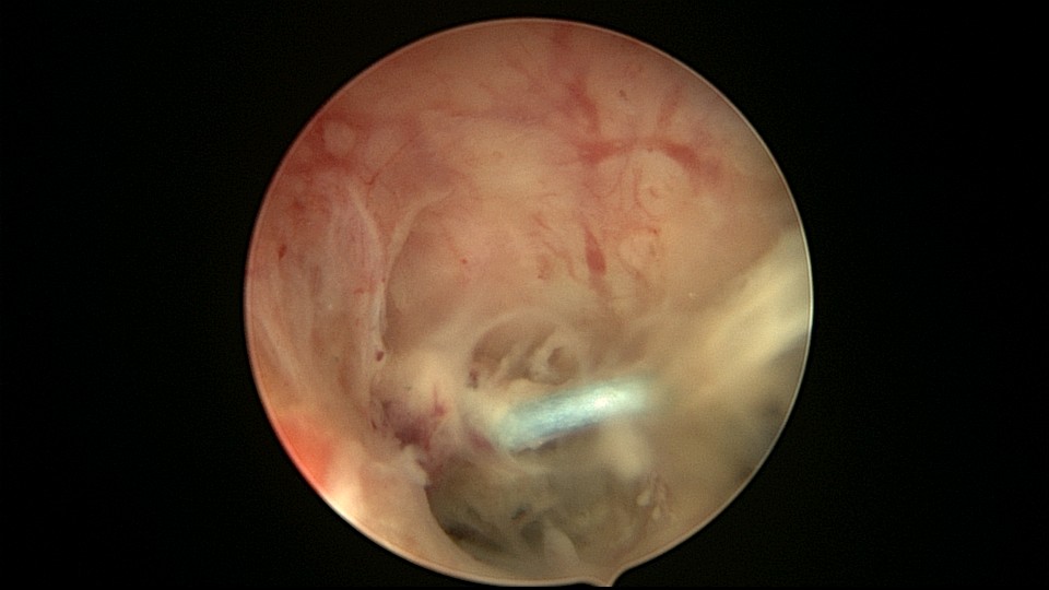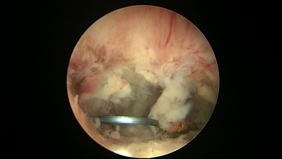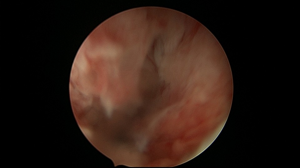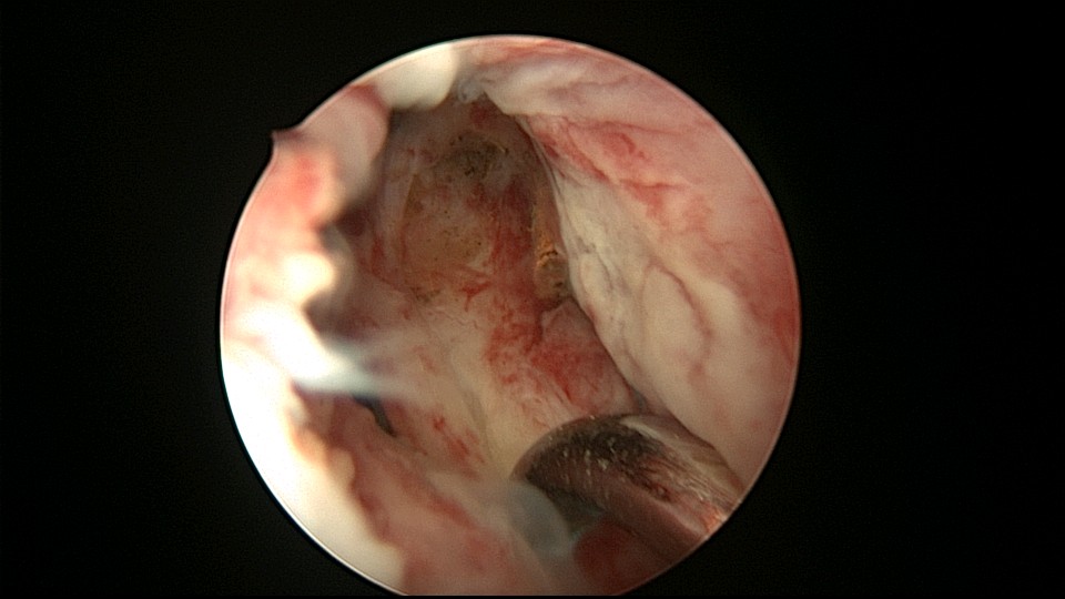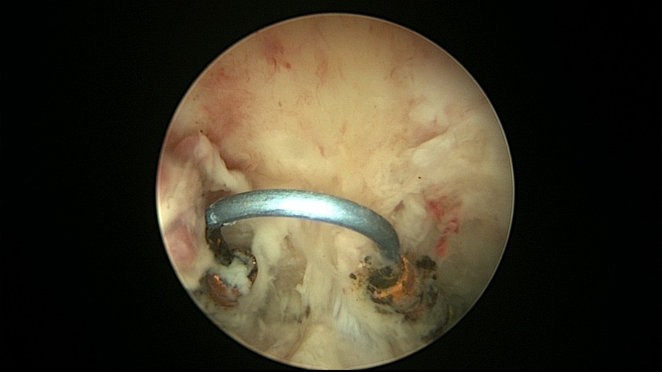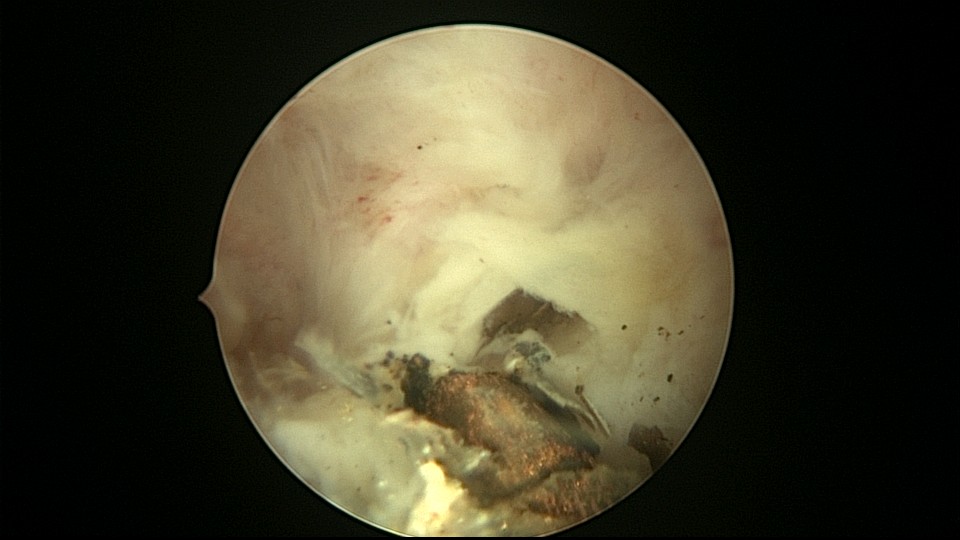 患者48岁,G3P1,顺产1次。安环10年,绝经1年,外院取环失败,子宫穿孔,腹部平片无异常。宫腔镜见宫腔广泛致密粘连,V型环与粘连组织嵌顿,取环钩盲视下多次尝试钩取节育环,均失败。取环钩循镜鞘外侧进入宫腔,直视下钩住节育环,顺利取出。再次置镜寻找子宫穿孔处并进入盆腔,见网膜脂肪组织,确认无活动性出血及盆腔积血,结束手术。
