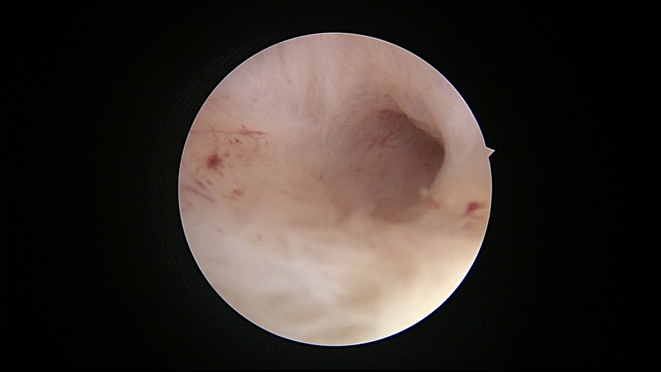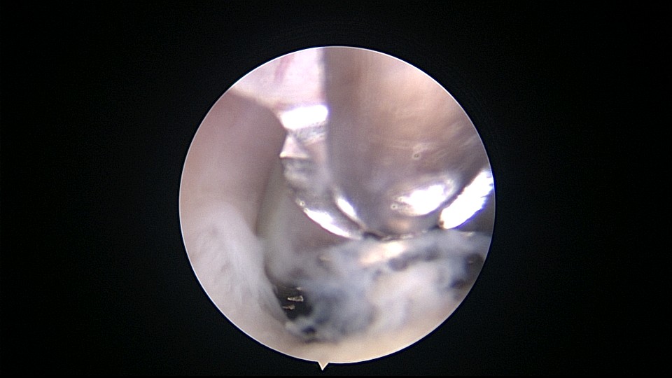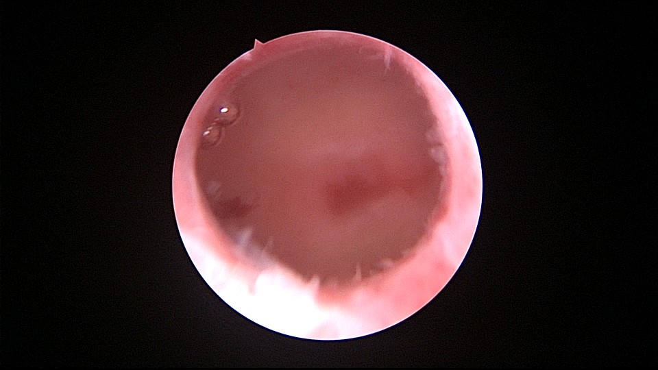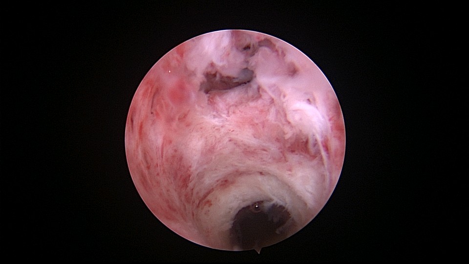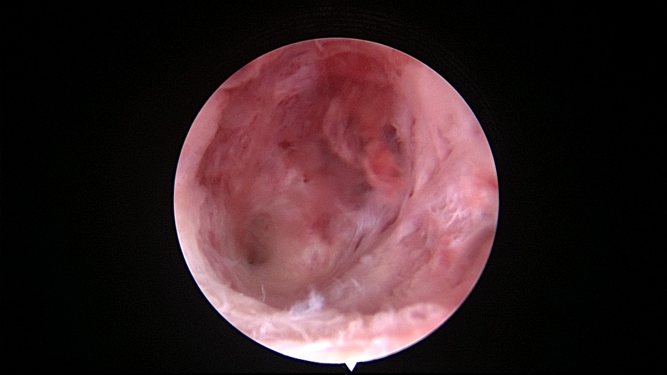 患者56岁,G2P1,剖宫产1次。安环30年,绝经7年,外院取环失败,形成假道。子宫后倾后屈位,宫颈外口萎缩狭小,宫颈管扩张膨大,宫颈管左前壁假道,宫颈内口狭窄坚硬,宫腔镜见宫腔偏向右后方,并向左后侧屈,镜子艰难进入宫腔,O型环位置正常,异物钳取出,宫腔无其他异常。