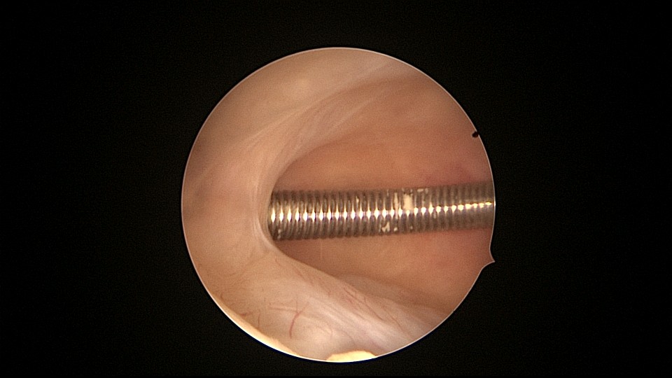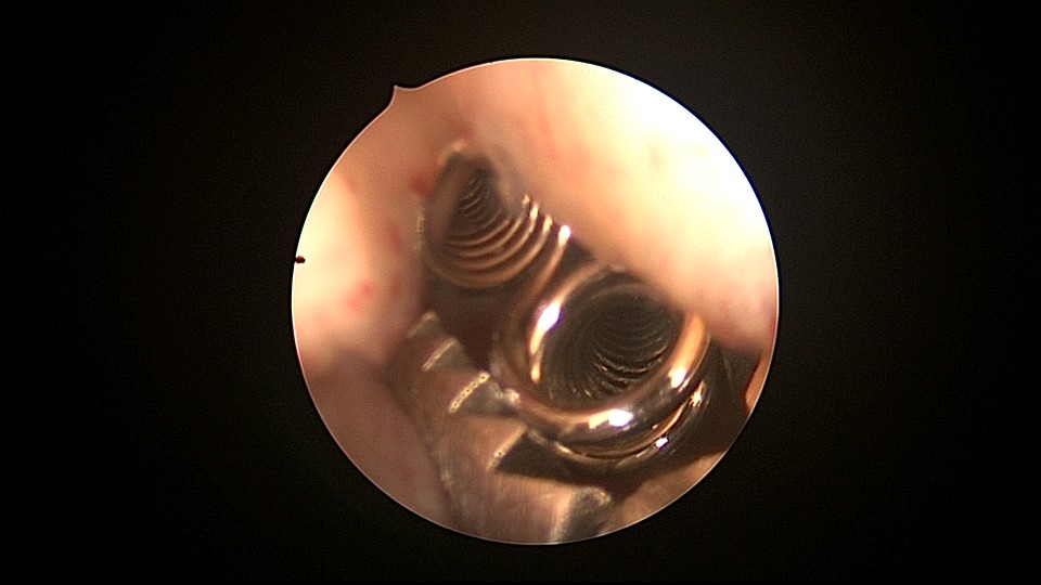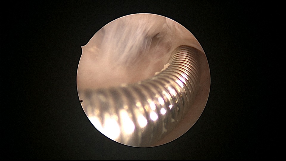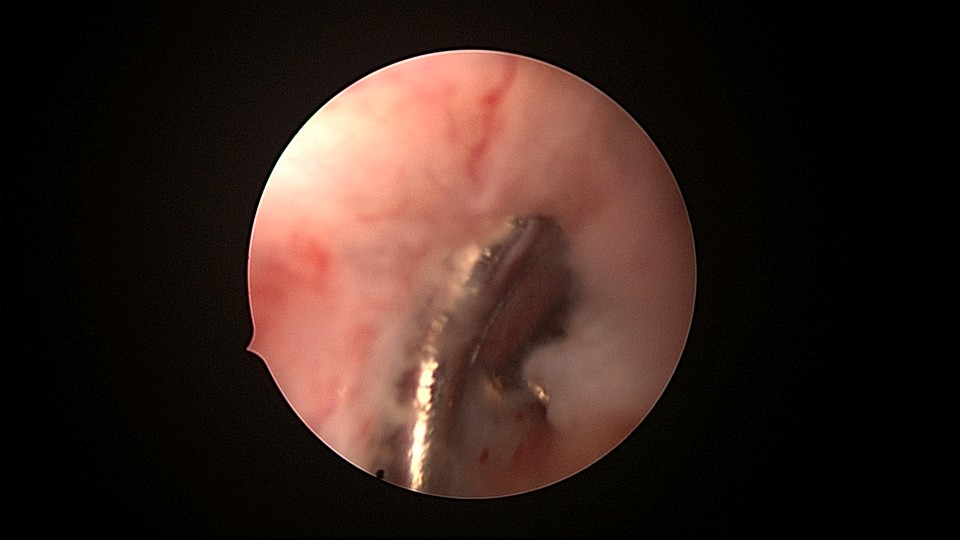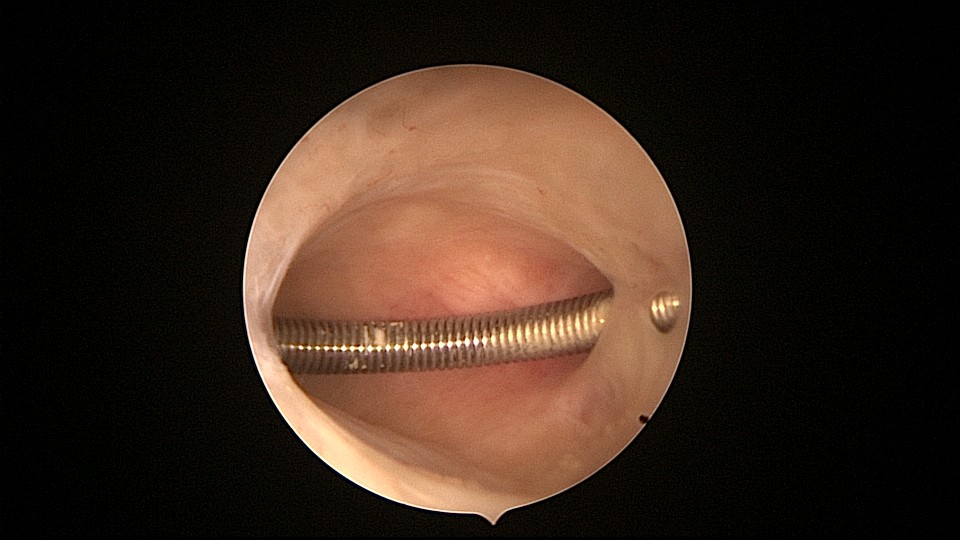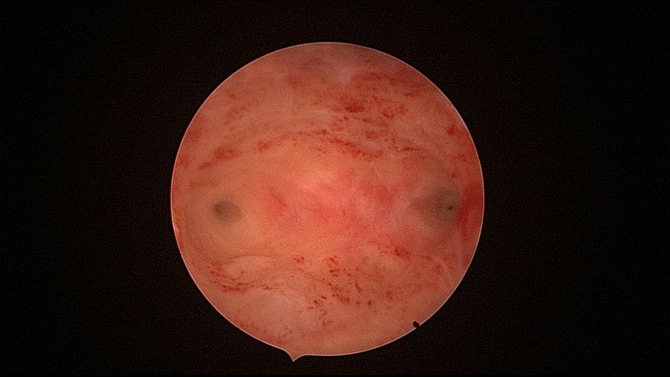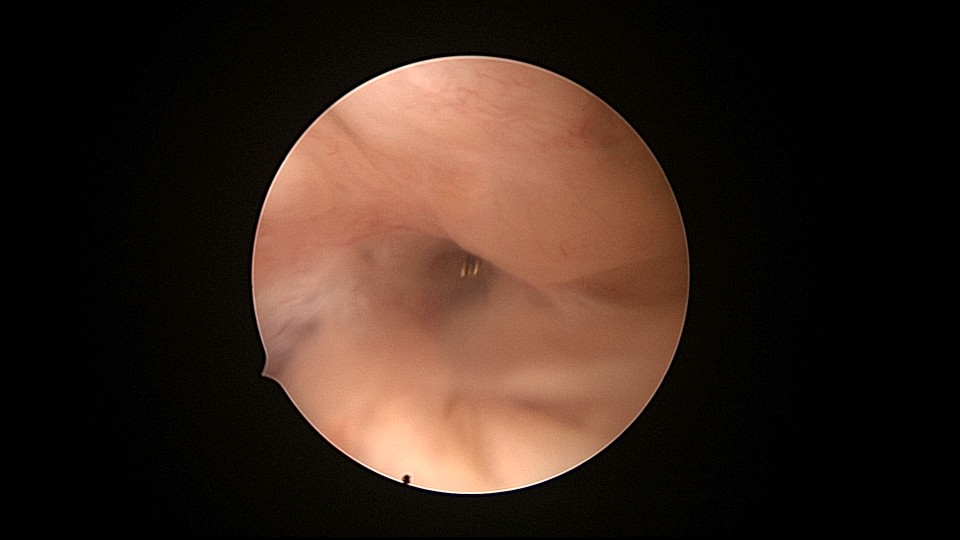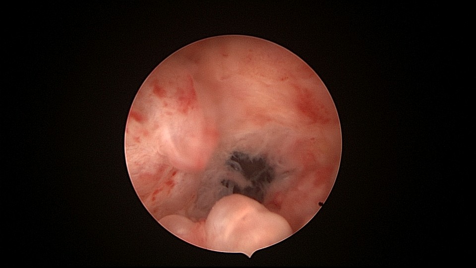 患者81岁,G5P5,顺产5次,安环50年,绝经23年,高血压病史多年,10年前因颅内肿瘤行开颅手术,4年前行腹腔镜胆囊切除术,外院介绍到我院宫腔镜取环。子宫前位,宫颈萎缩,穹隆展平,宫颈外口位于穹隆偏左侧,平滑狭小,夹持宫颈很困难,阴道内镜方式进入宫腔,见宫腔下部O型环圈内前后壁粘连,顿性分离粘连,宫腔中上部O型环与两侧宫壁嵌顿,异物钳松动节育环,但难以取出,取环钩沿镜鞘外侧进入宫腔,配合中弯钳牵拉出节育环,环变形,检查环完整,宫腔无其他异常。