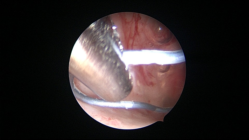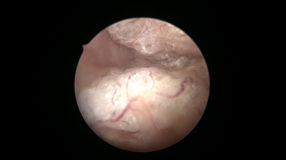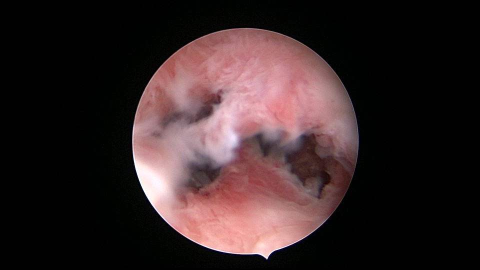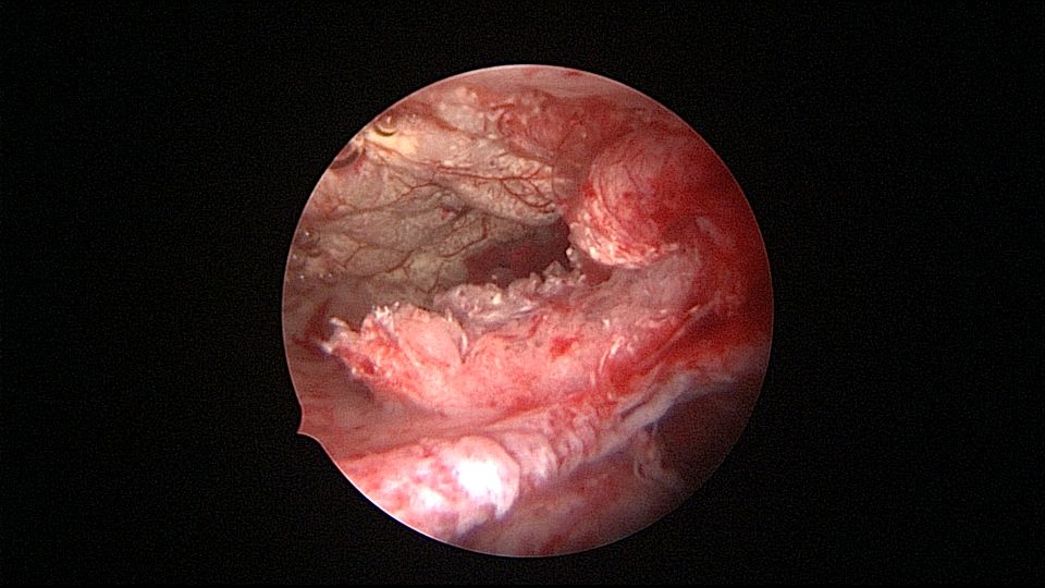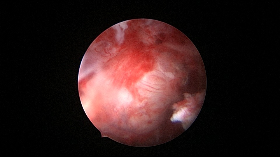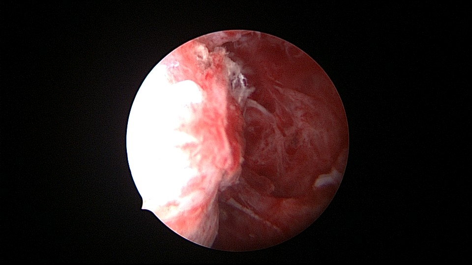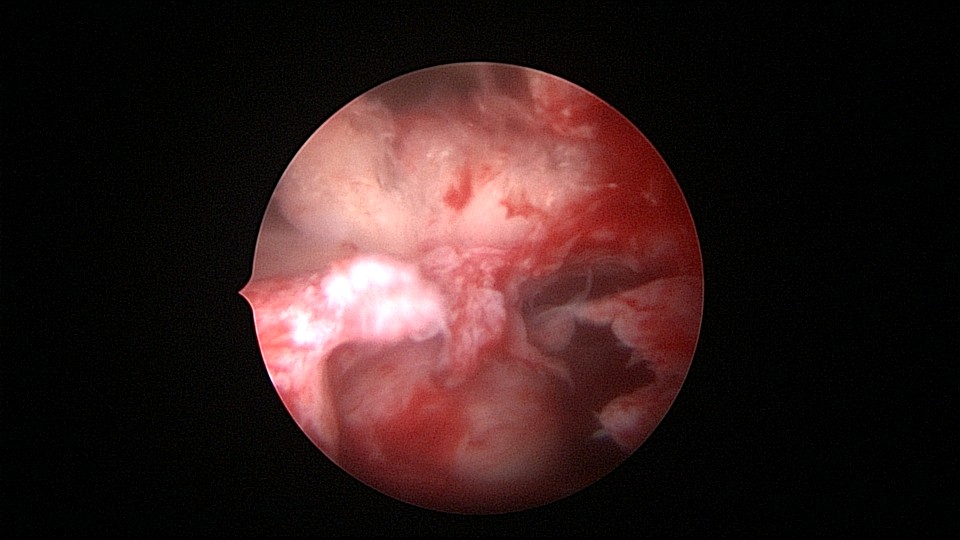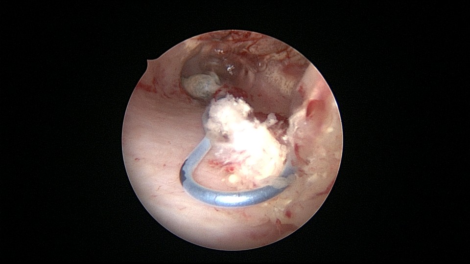 患者55岁,G4P1,顺产1次。安环16年,绝经5年,外院取环失败。子宫前位,宫颈萎缩,宫腔下段左后壁见假道,假道内见肌瘤结节突出,爱母环位置正常,宫腔左侧壁及前壁见占位质脆组织,表面有异常粗大血管。异物钳顺利取出节育环,占位组织病检为内膜样癌。取环造成的假道让病人因祸得福,提前发现了子宫内膜样癌,得以及时手术治疗。