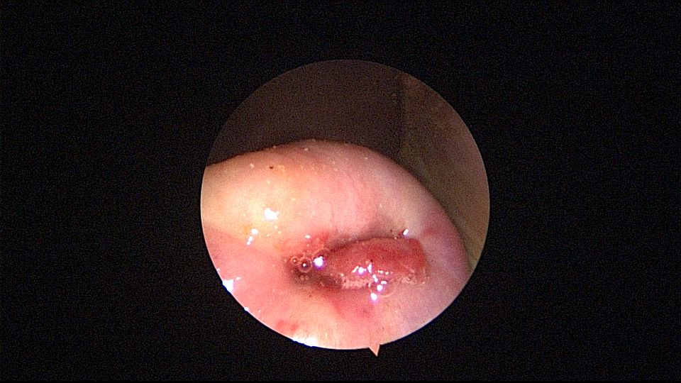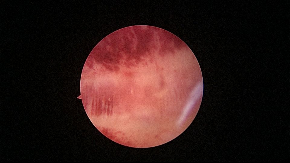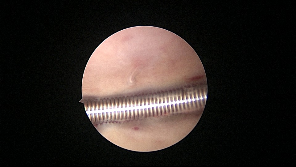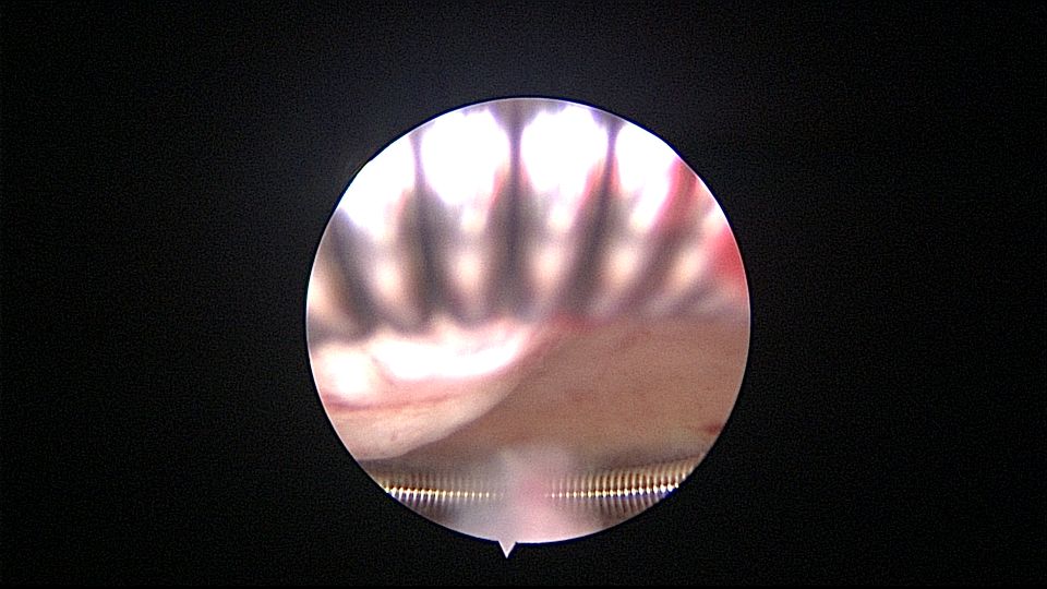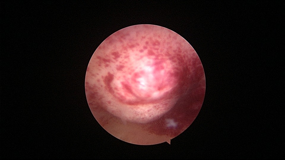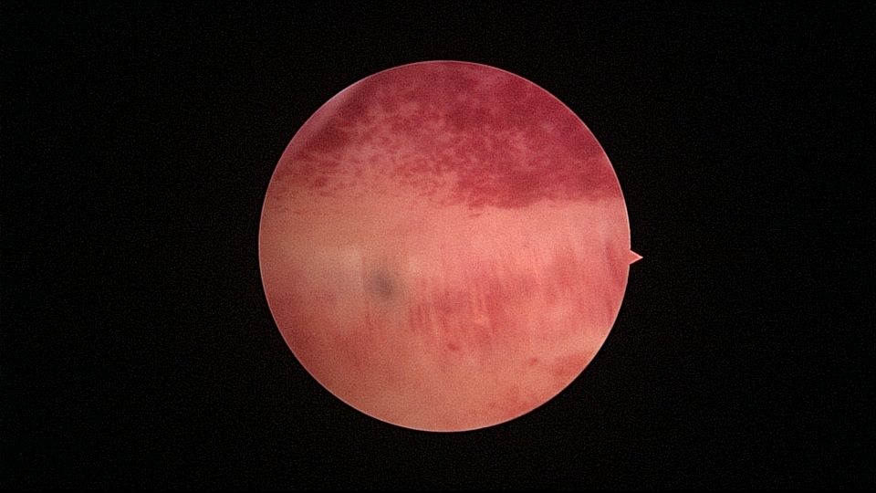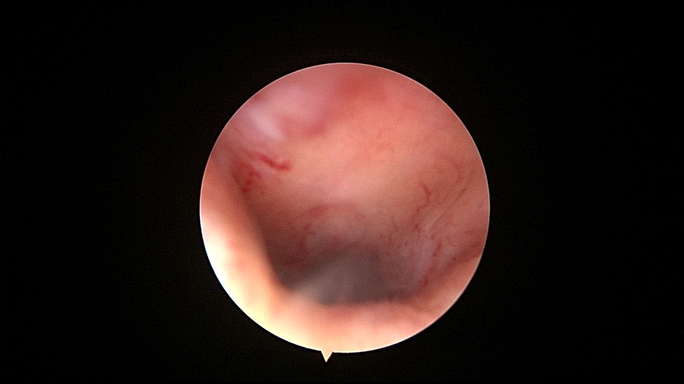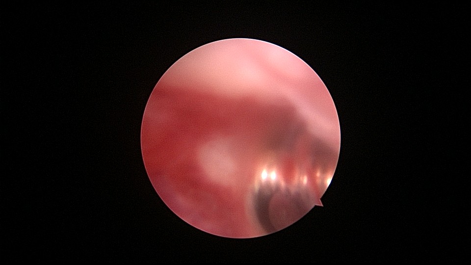 患者55岁,G1P1,顺产1次。安环34年,闭经半年,2天前外院取环失败,感下腹疼痛不适。术前复查B超,子宫前壁肌瘤直径4cm,宫内节育器回声。术中见子宫前倾后屈位,宫颈外口见息肉,镜鞘旋转扩宫进入宫腔,O型环位置正常,宫腔右前壁见直径2.5cm肌瘤结节突向宫腔,取环钩顺利取出节育环,宫腔无其他异常。该患者常规取环时未膨宫,子宫位置特殊,加之子宫受刺激后肌瘤凸向宫腔,可能对取环器械形成支点及杠杆效应,取环器械难以到达节育环位置,导致取环失败。