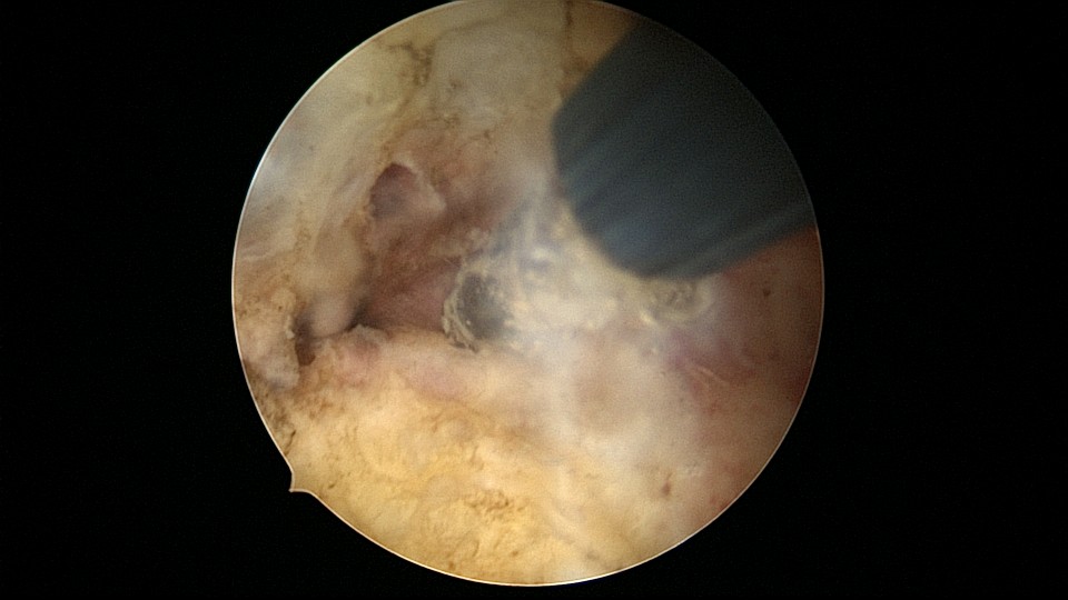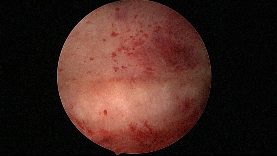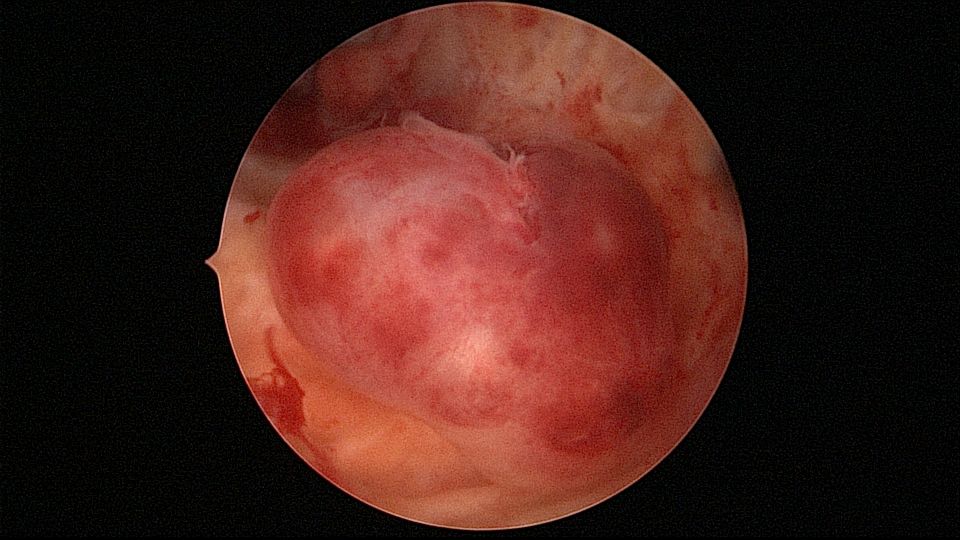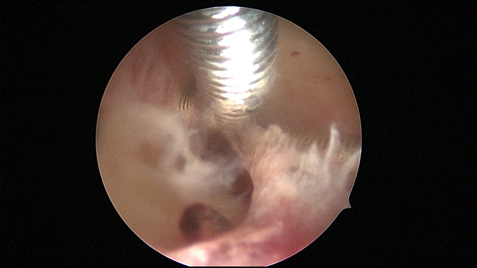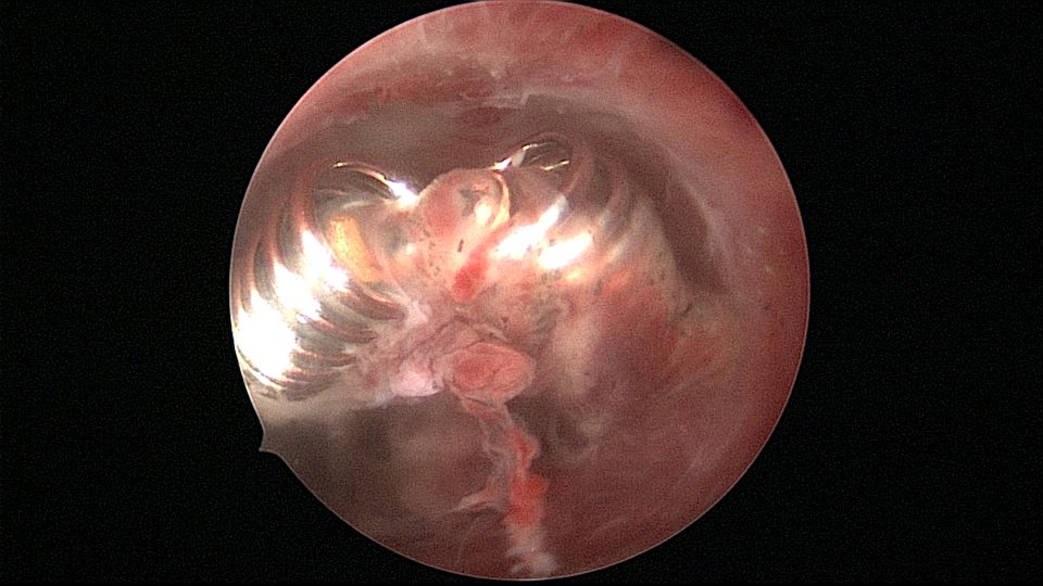 患者56岁,G2P1,顺产1次。安环16年,绝经1年,外院取环失败。宫颈外口及宫颈内口狭小质硬,分别用中弯钳及异物钳扩张,宫腔镜见宫颈管息肉2个,宫型环与宫壁嵌顿,异物钳取出,单级电针切除息肉送病检,病检结果为宫颈管息肉,宫腔未见其他异常。