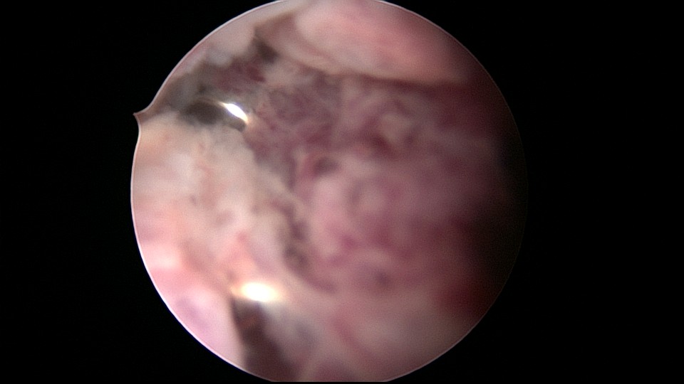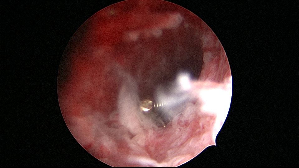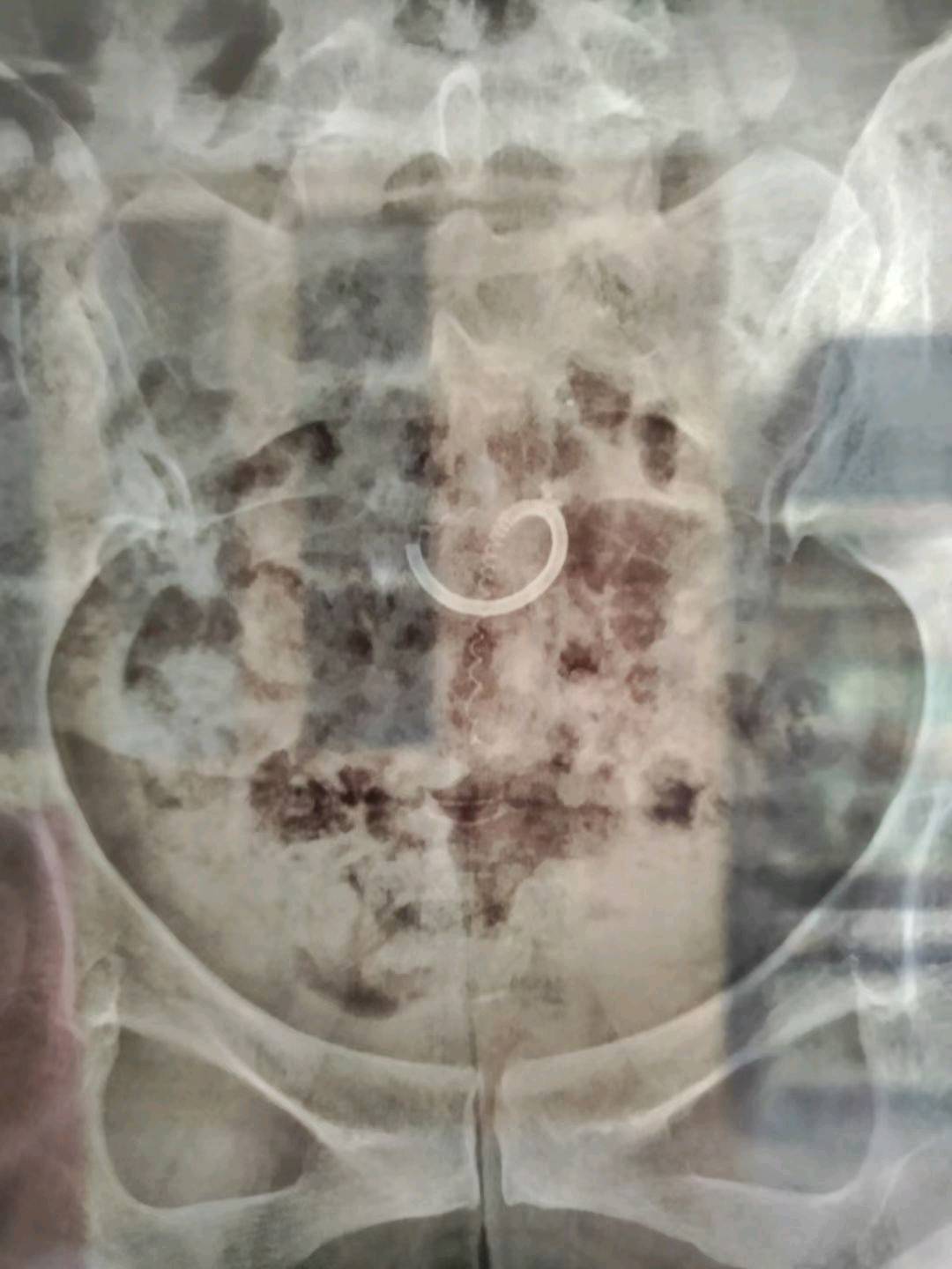 患者45岁,G1P2,剖宫产双胎1次(自然妊娠)。安环23年,异常子宫出血月经淋漓不尽2个月,外院取环残留,环断裂,外院医生述取出约10cm变形环段,腹部平片见O型环断裂,断端指向宫颈管。宫颈位于前穹隆顶端,暴露困难,艰难置入宫腔镜,见内膜杂乱,反复寻找才发现O型环残环,残环两侧与宫壁嵌顿,异物钳抓取数次均滑脱,顺宫颈管向下寻找,在宫颈管中上段找到环断端,异物钳缓慢拉出断端至宫颈外口,中弯钳配合卵圆钳牵拉,环断裂,取出约10cm环残段。宫腔镜再次进入宫腔,找到剩余残环,异物钳夹取,多次滑脱,取环钩顺着镜鞘外侧进入宫腔,钩住残环,缓慢下拉至宫颈外口,中弯钳配合卵圆钳拉出约12cm环残段,宫腔镜再次探查宫腔,镜下未见环残留,取内膜送病检。术后病人离院时复查B超,有强回声带,因宫腔少许气体干扰,无法确定是否环残留,嘱病人一周后复查B超,确定无环残留。第一次遇到这么脆弱的金属圆环,很容易断裂。病检为子宫内膜增生,不伴非典型增生。