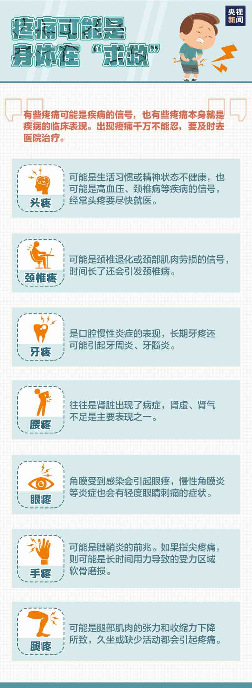 疼痛是身体出现问题后发出的警示信号,应该引起重视,积极采取应对措施。如果一直拖着不去看医生,很有可能会使急性疼痛转为慢性疼痛,甚至发展为严重的健康问题,治愈的几率会大大降低。