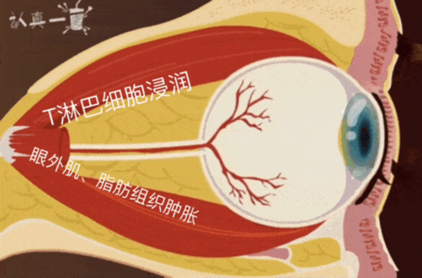 甲亢的病因有很多种,其中约80%为Graves病(弥漫性毒性甲状腺肿)引起,其具体病因目前尚不明,但已知病理机制中最主要的原因就是存在针对甲状腺的自身抗体,此病属于器官特异性自身免疫疾病,由于其自身免疫的的机制,在疾病病程中,大量淋巴细胞在眼球后的侵润,眼眶后成纤维细胞大量分泌多糖和糖肽聚糖并在眼球后组织沉积,导致眼外肌和脂肪肿胀,最终引起突眼