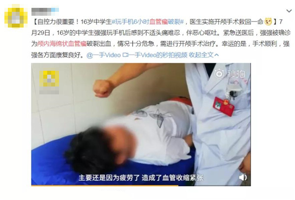 16岁的中学生强强,玩了6个小时手机游戏后,感到头部疼痛难忍,伴恶心呕吐,紧急送医后,强强被确诊为颅内海绵状血管瘤破裂出血,病情十分危急,医生紧急开通绿色通道为其行开颅手术治疗。目前强强各方面康复良好,医生解释强强的海绵状血管瘤破裂出血的主要原因是,长时间玩手机劳累造成血管收缩紧张,导致破裂出血。