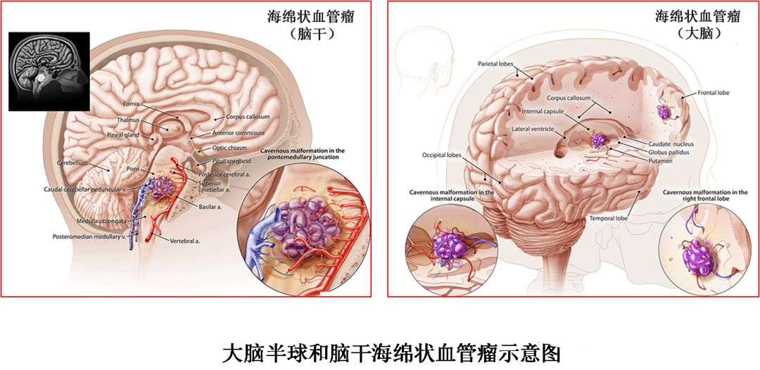 颅内海绵状血管瘤虽然名字里有一个“瘤”,但并非肿瘤!它是一种脑血管畸形病,指在正常的脑部(通常为脑干、延髓部位)血管附近长出非正常的分支血管,经过这些毛细血管的血流量很大,压力高,如果因为情绪激动、熬夜、外力冲击等原因,特别容易挤破血管,造成致命性的颅内出血,被称为脑内的“定时炸弹”。