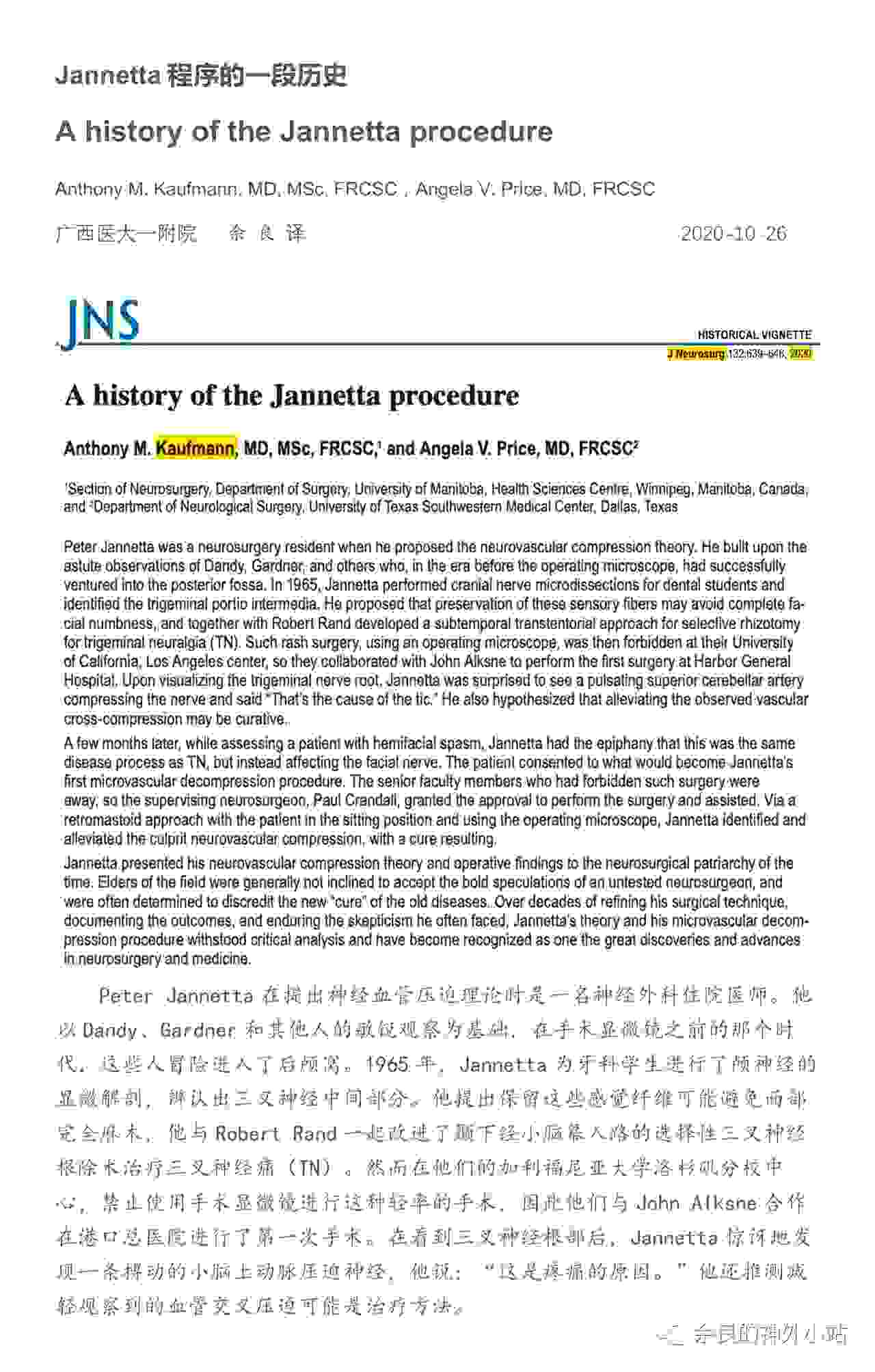 Jannetta的血管神经压迫理论和他的程序(Jannetta Procedure)被公认为是神经外科和医学领域的重大发现和进步之一。Jannetta教授仙逝4年后,JNS杂志发表纪念文章,详细介绍了他的理论提出及手术发展、完善的过程。