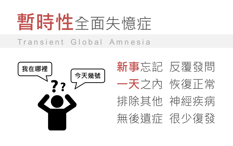 在教科书中这样描述短暂性全面遗忘:发作时出现短时间记忆丧失,对时间、地点定向障碍,但谈话、书写和计算能力正常,一般症状持续数小时,完后完全好转,不遗留记忆损害。