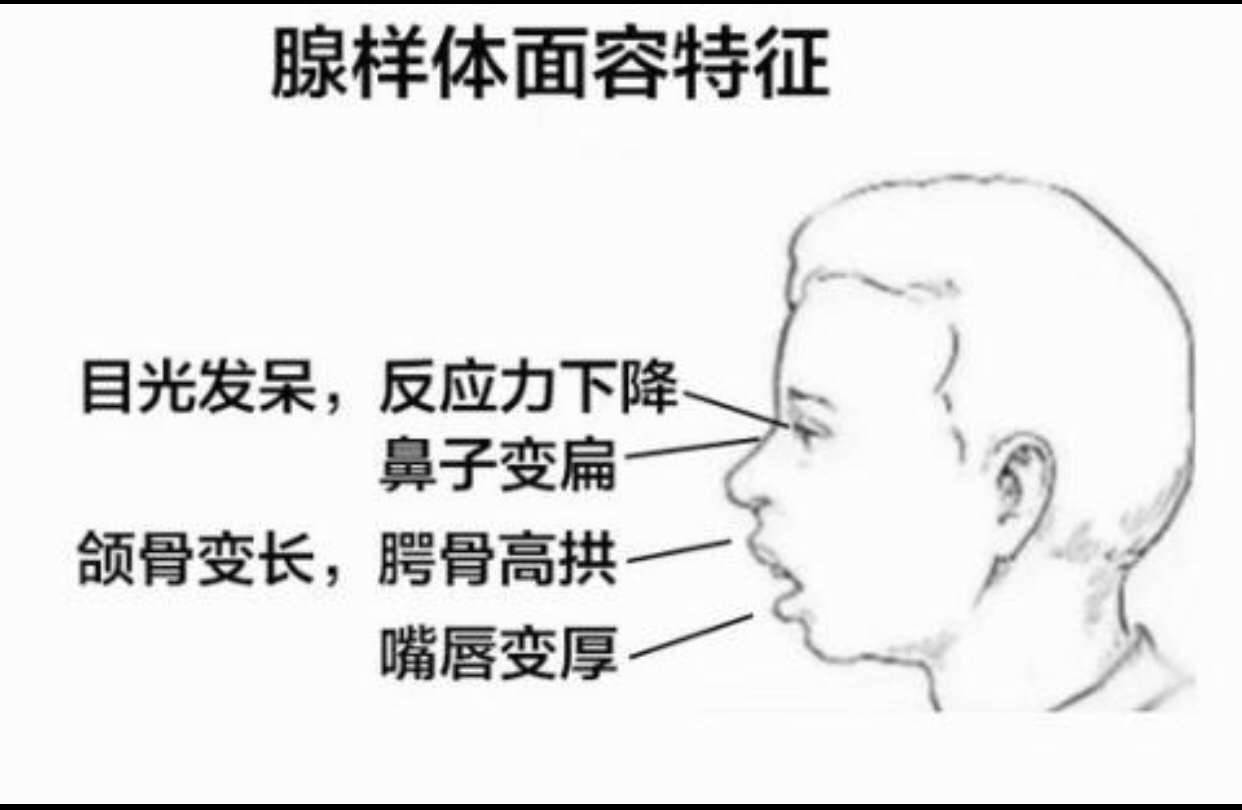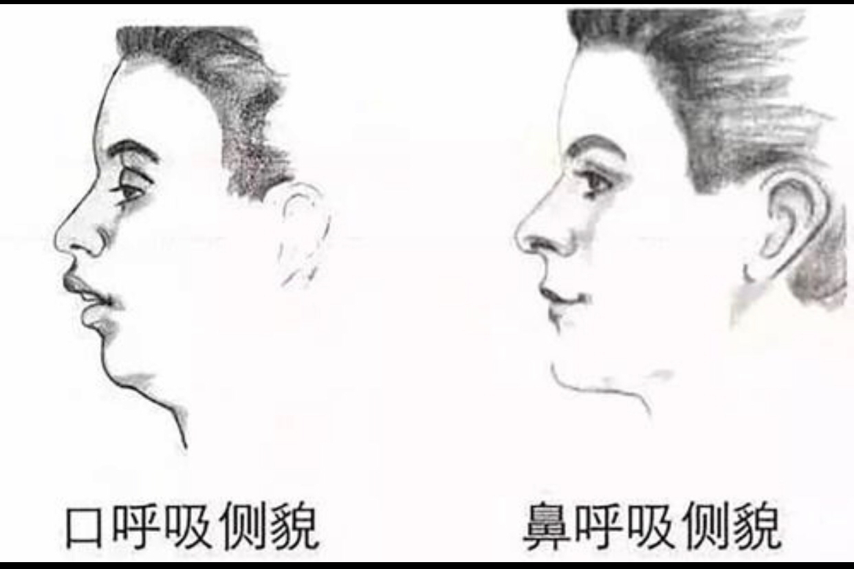 而长期的张口呼吸又会导致面部发育异常,嘴唇变厚、外翻,上门牙前凸,下颌变短,面部拉长,孩子变得越来越丑,就是我们所说的腺样体面容。