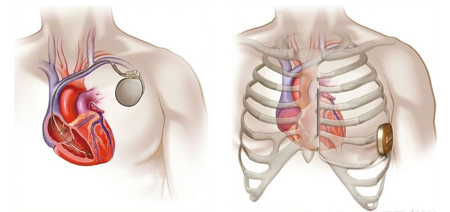 传统植入式心脏除颤器ICD(左)和新一代全皮下植入式心脏除颤器S-ICD(右)