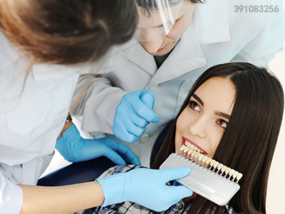 美白前,用专用的比色板来看患者牙齿的颜色,进行比色和记录。