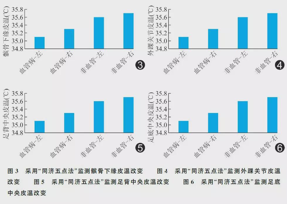 每日3次,于餐前30min检查空腹血糖。治疗前、术中及术后随访时,采用“同济五点法”进行皮温监测,即检测额头、髌骨下缘(膝关节网动脉)、外踝关节(腓动脉)、足背中央(足背动脉)、足底中央(胫后动脉)各点的皮温,以额温作为基线,对照其他4点(括号内为与Angiosome相对应的下肢动脉)所测皮温,评价治疗前后的临床疗效(图3~6)。