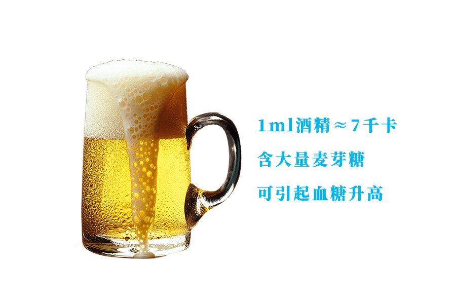 酒类,特别是酒精度数高的酒类,其主要成分是乙醇,虽然它不能生成葡萄糖,但是它会干扰葡萄糖的分解供能。1ml的酒精大约会产生7千卡的热量,影响了葡萄糖的利用,间接造成血液中葡萄糖含量的升高。啤酒中酒精浓度虽然不高,但含有大量的麦芽糖,也会引起血糖增高。