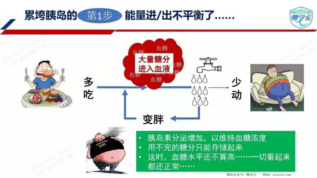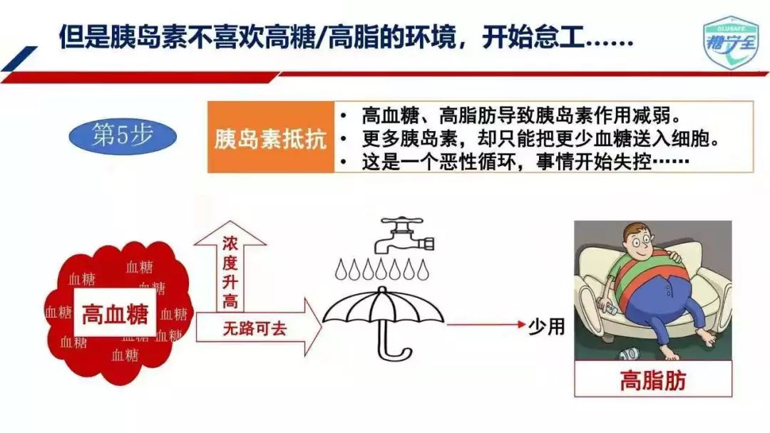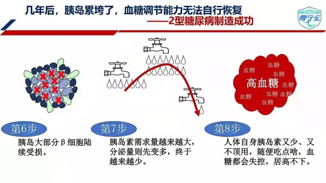 为此,胰岛β细胞不得不分泌更多胰岛素来把血液中的葡萄糖转运走。长此以往,分泌胰岛素的胰岛β细胞不堪重负,出现功能减退。如此循环下去,血液中的葡萄糖水平越来越高,最终超过正常人的血糖范围发展成为糖尿病。