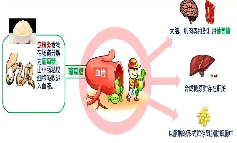 比如说我们主食的主要成份是淀粉,虽然不是糖,但最终会在肠道被分解成葡萄糖,被小肠上皮细胞吸收入血,升高血糖水平。所以,不是只有吃糖血糖会升高,长期主食过量也会产生糖尿病。特别是粥、糯米及其他精细加工的主食,因为其吸收快,餐后血糖峰值高,其升糖指数接近葡萄糖和蔗糖,也是很多糖友患上糖尿病的因素之一。