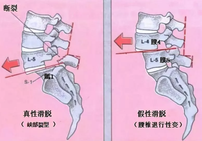 由于腰椎间盘、椎小关节等退行性改变,腰骶角较大、腰椎骶化,腰骶部骨性畸形、腰椎曲度异常等原因导致椎体滑脱。