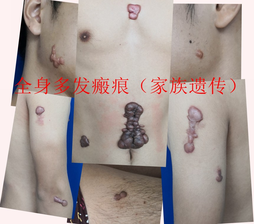 临床上发现,部分瘢痕疙瘩患者有明显的家族遗传倾向,尤其是全身多处多发者,直系、旁系三代亲属中可发现同样瘢痕疙瘩患者,有人认为属常染色体显性遗传,但具体遗传方式还不甚清楚。同时我们也观察到,单处、单发瘢痕疙瘩患者则少有亲属罹患本病。