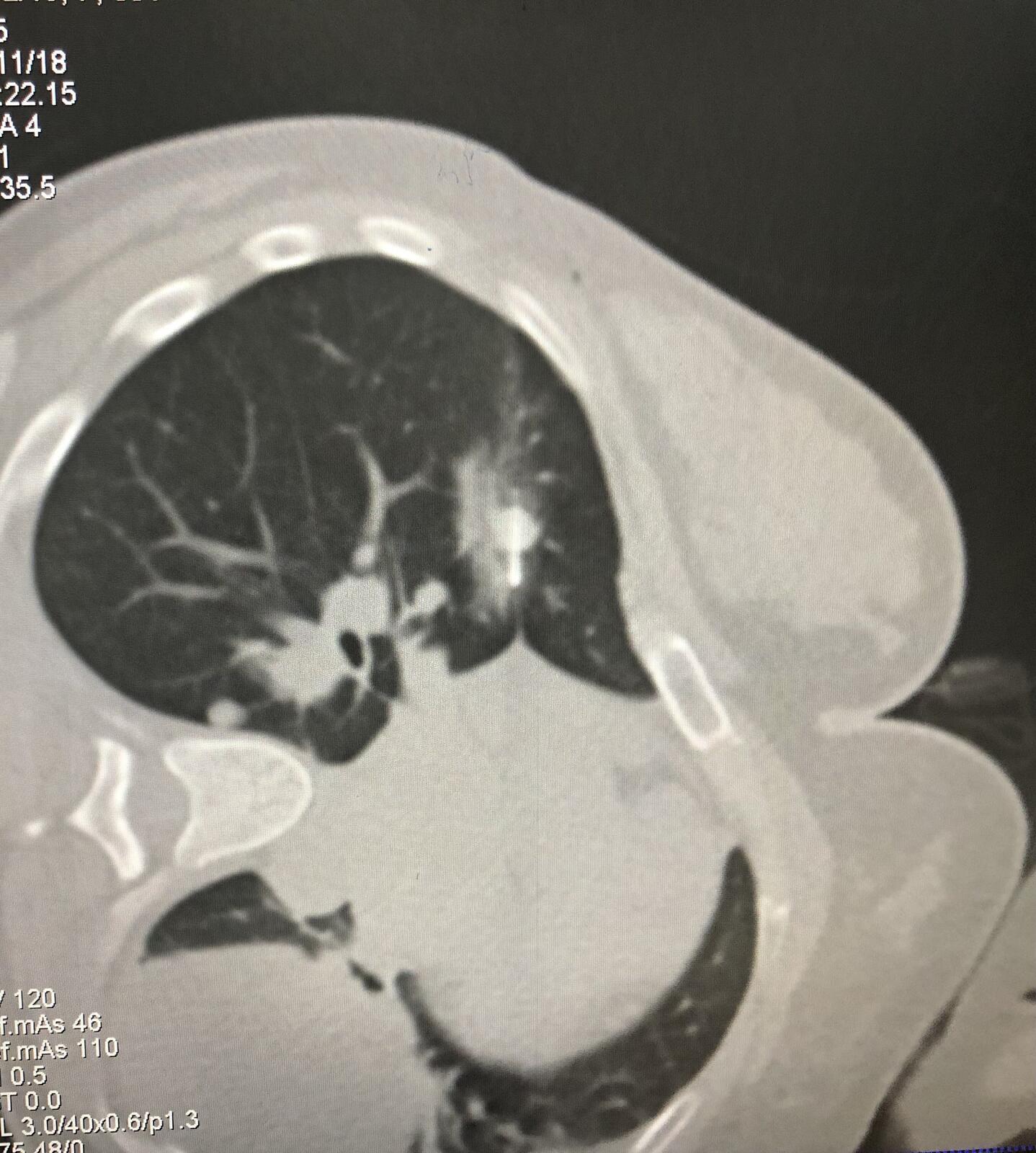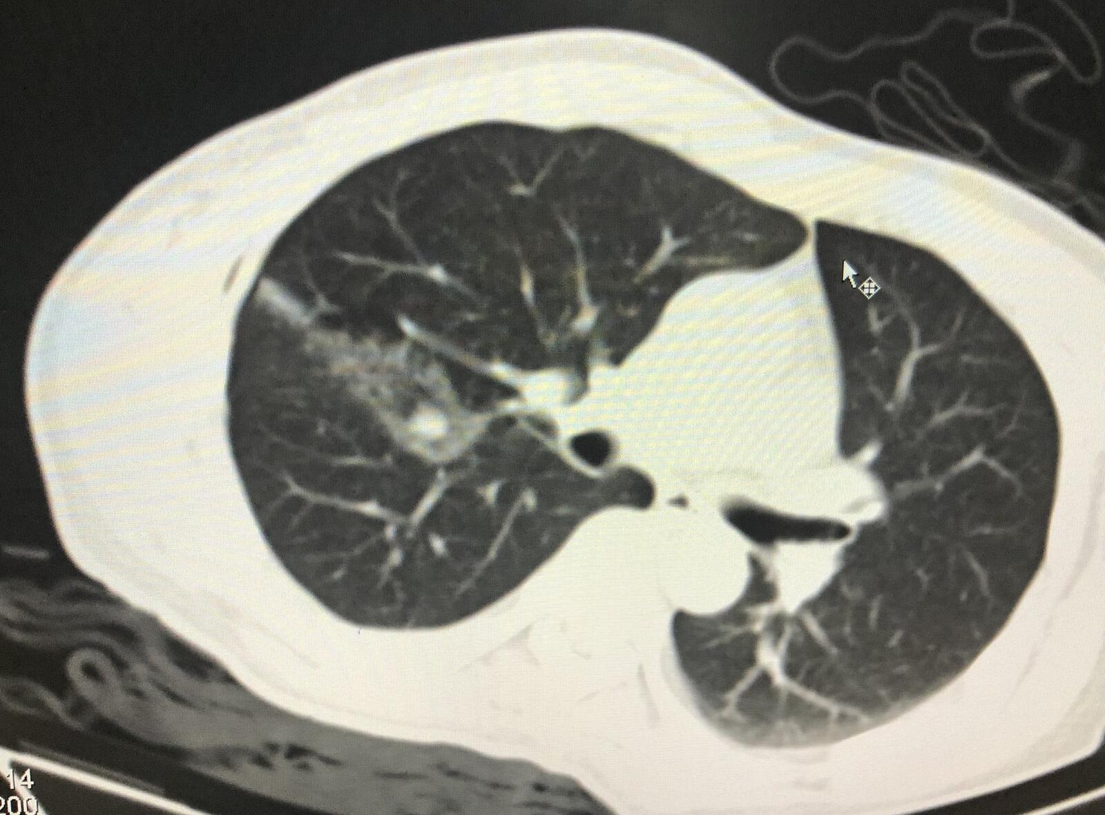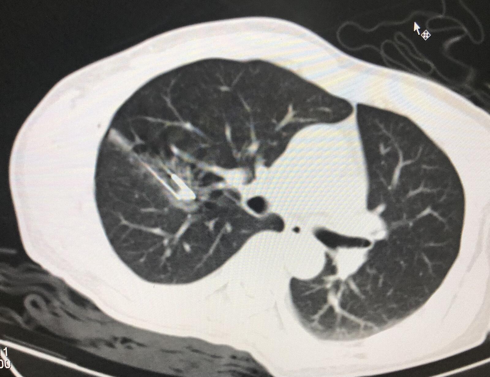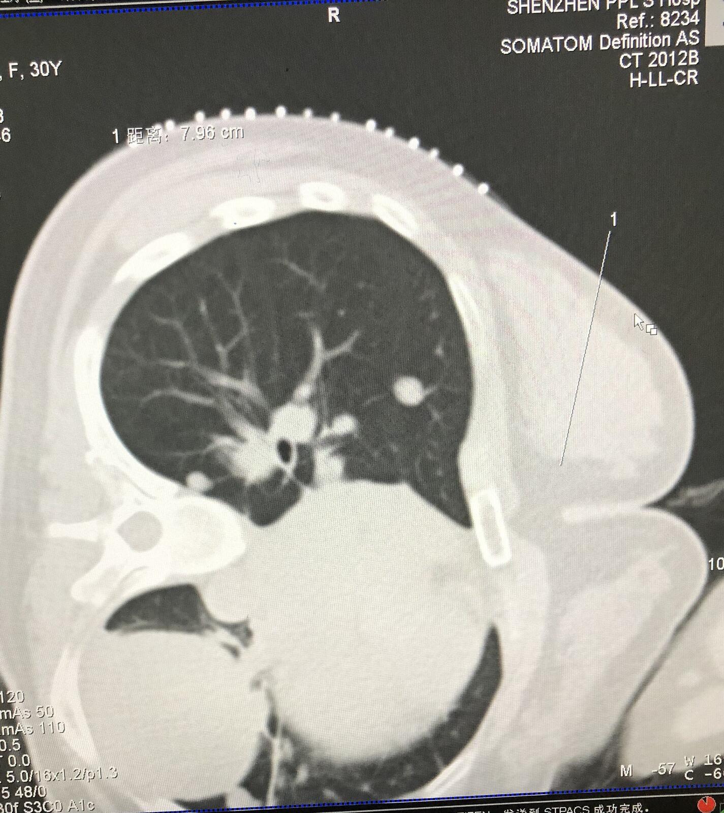 右肺转移瘤直径约1.3厘米,患者侧卧位。