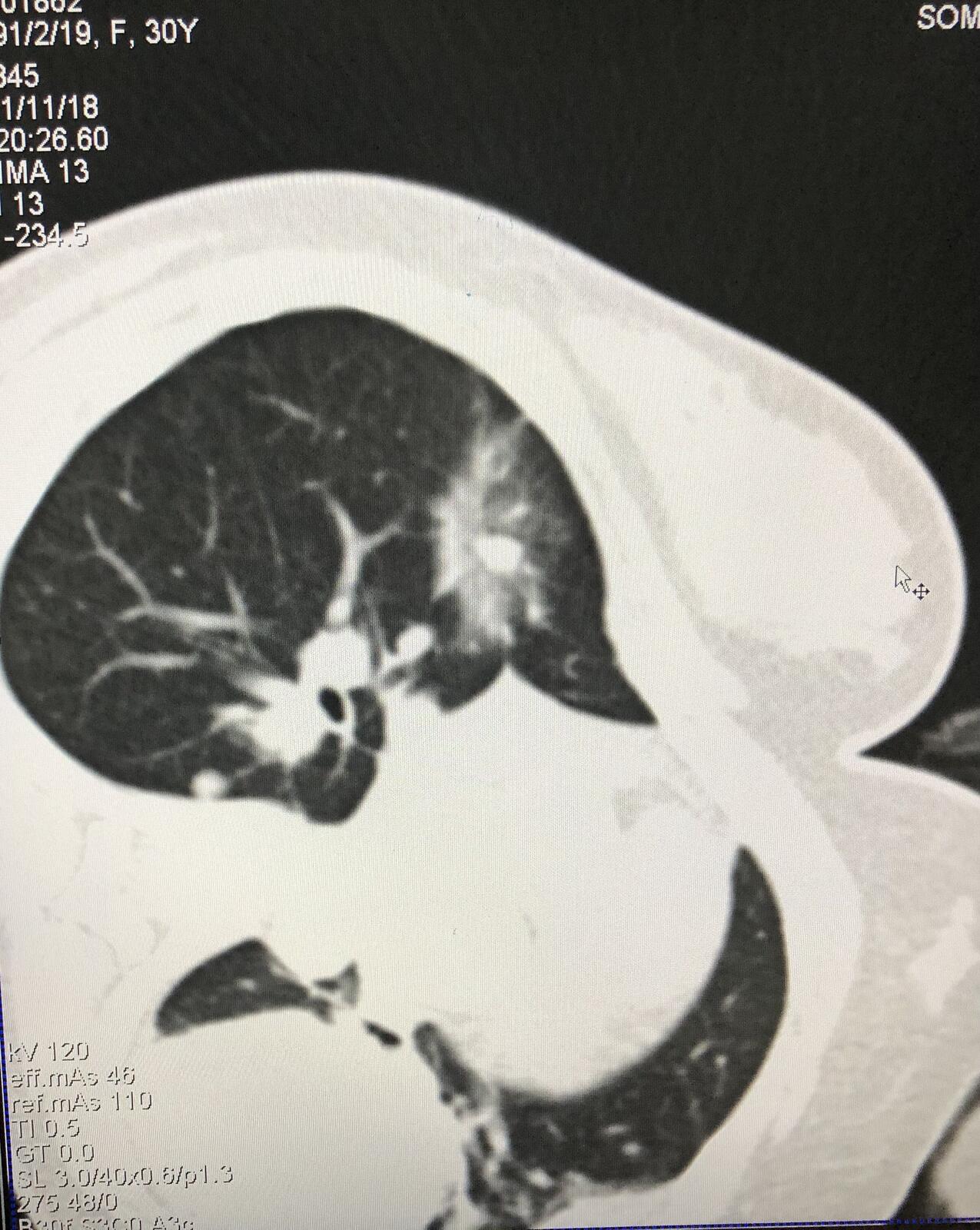 2.患者女性31岁,腺泡状软组织肉瘤术后肺转移,行微波消融治疗。