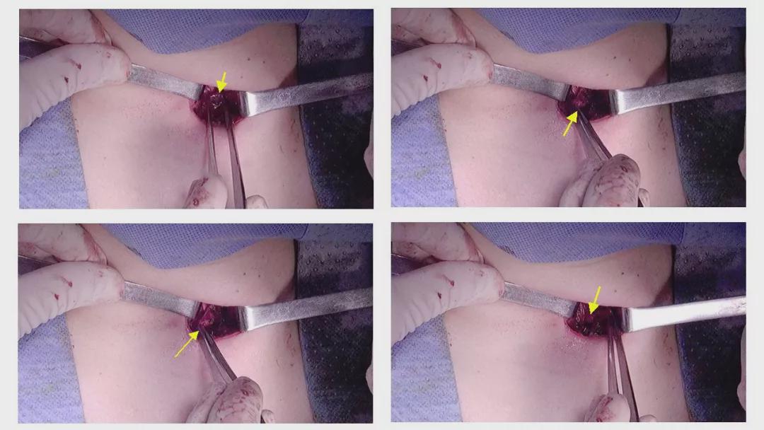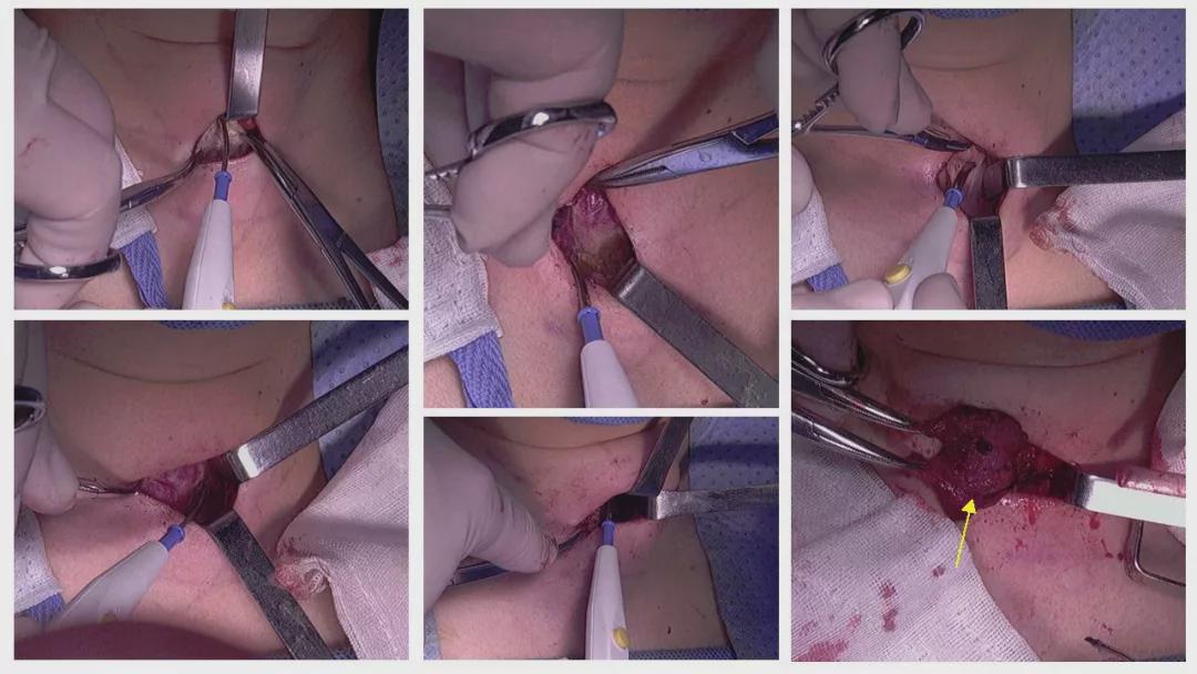 术中快速病理再次证实为甲状腺乳头状癌,拟行中央区淋巴结清扫(下图箭头所指为游离并保护带完整血供的右侧甲状旁腺)。