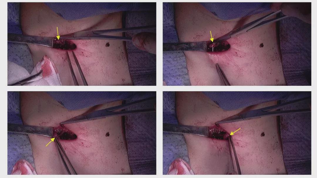 因为切口小,操作空间有限,血管的结扎就成了比较困难的事,运用移行电凝技术,我们可以直接用电刀凝闭甲状腺的供血分支,安全切断而不出血,省去结扎的过程(当然也就不会在体内留下线结),从而让细长的电刀头在小切口内游刃有余(箭头处为已经游离的甲状腺左侧叶)