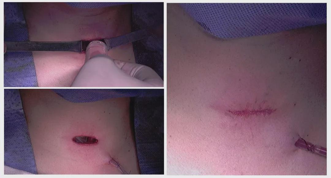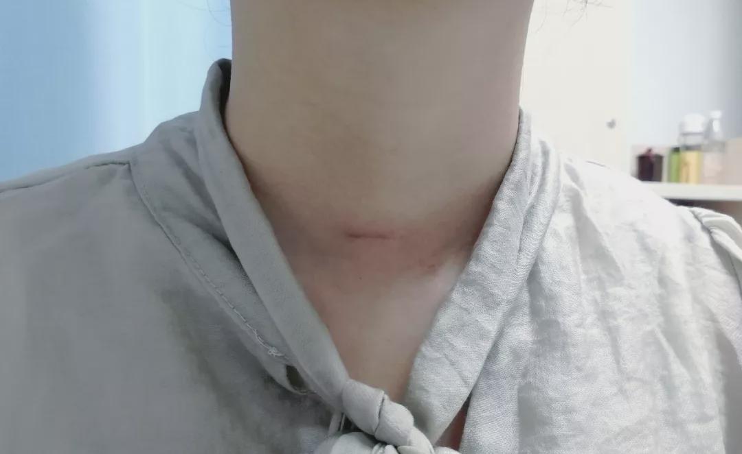 此例患者为22岁女性,术前甲状腺结节细针穿刺怀疑甲状腺乳头状癌,患者本人一怕腔镜手术做不彻底,二怕开放手术瘢痕太大,而在腔镜手术和开放手术方式之间犹豫不决,最后选择了小切口的开放术式。