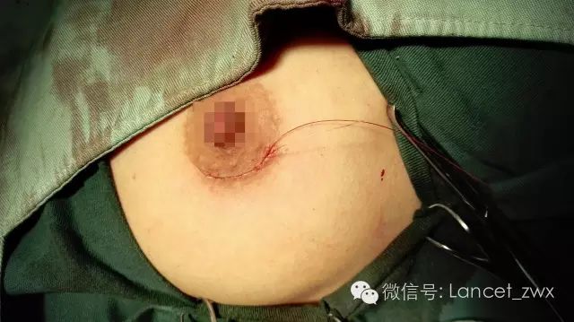 这种在乳晕边上的术口,愈合后应该不容易看出来,但是,有些人还是在意:这还是有个瘢痕!有个瘢痕!!瘢痕!!!(呵呵,怪我咯.....)。而且这种切口对于在乳腺外侧远离乳晕的肿块,切除起来实在有困难(脑补一下挖矿工人的工作)。