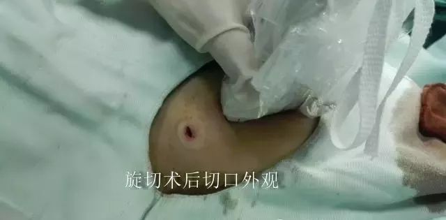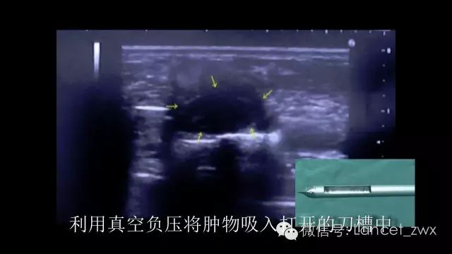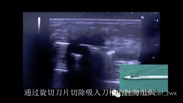 这种手术时只需要开一个3毫米左右的小口,通过此小口将旋切刀伸至目标肿物下方,在彩色超声实时引导下,将病变部位吸入旋切刀真空槽内,通过旋切刀片切除槽内肿物组织,反复此过程,直至将肿物完全切除,切除肿物通过负压吸引吸出至旋切刀后方的标本盒内。整个手术过程实时显示在超声显示屏上,手术采用局部麻醉,操作时间短,患者全程清醒无明显不适,术后皮肤伤口愈合后,几乎无明显疤痕。